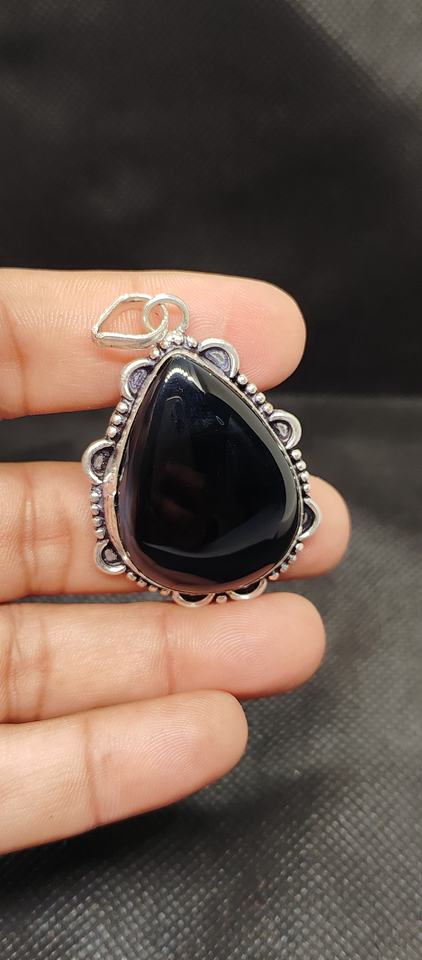 Brass Pendant with Natural Black Onyx Cabochon Gemstone Pendant