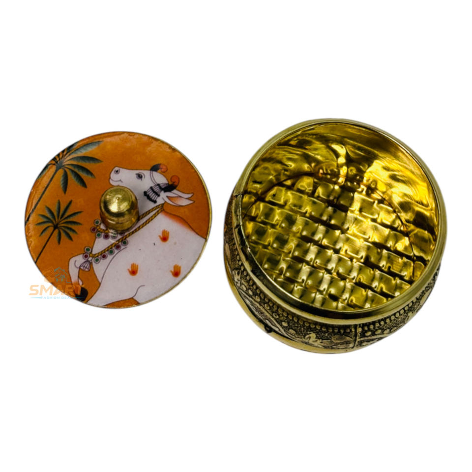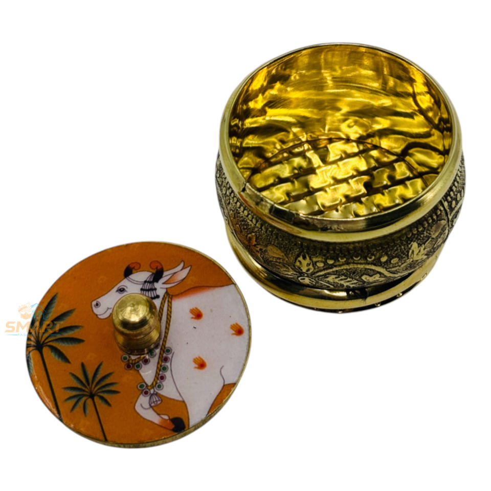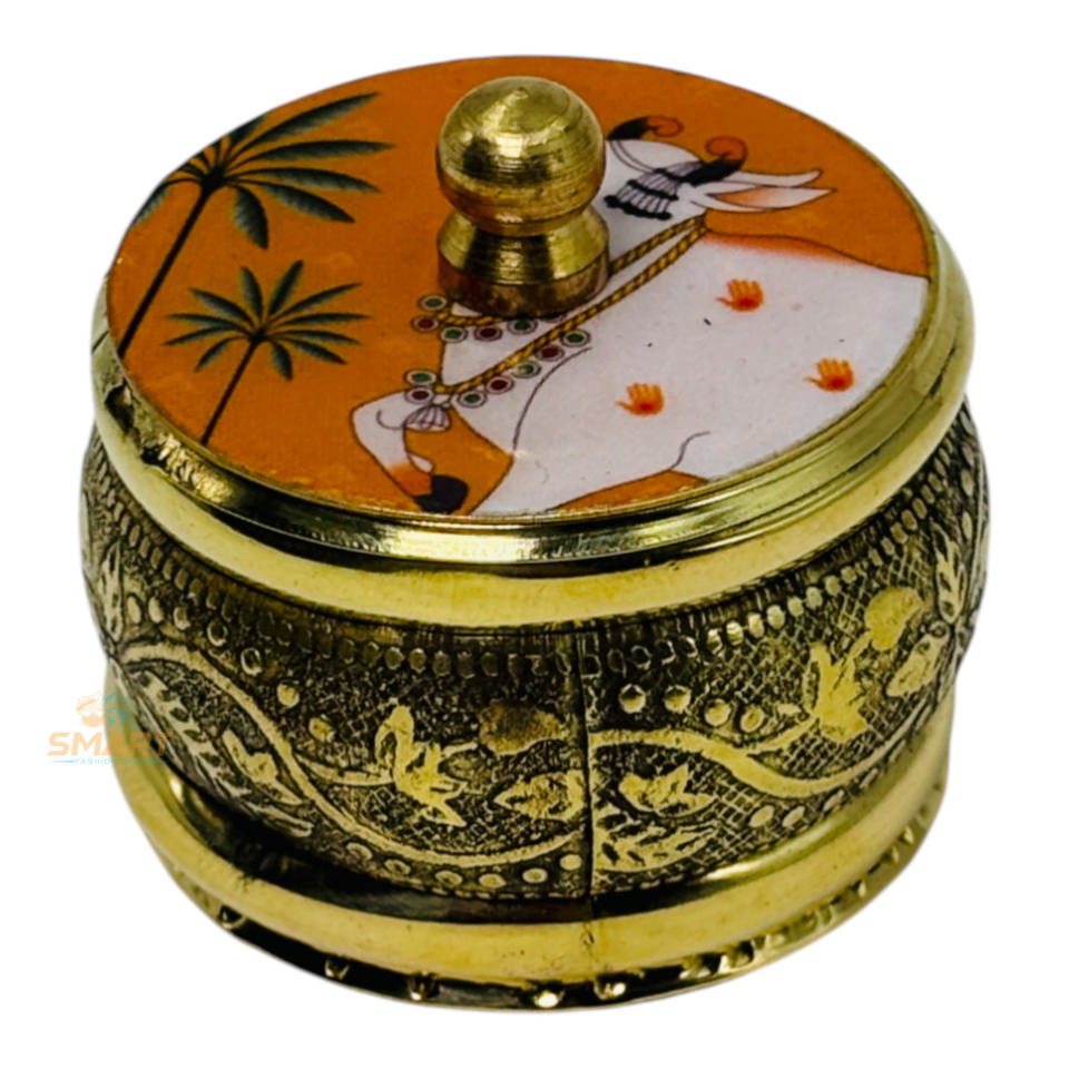 Brass Pichwai Printed Sindoor Dibbi Festival & Decorative Metal Craft for Gifting