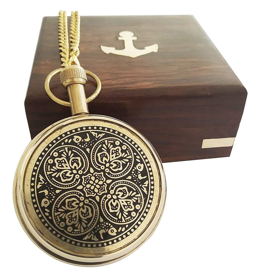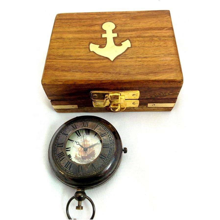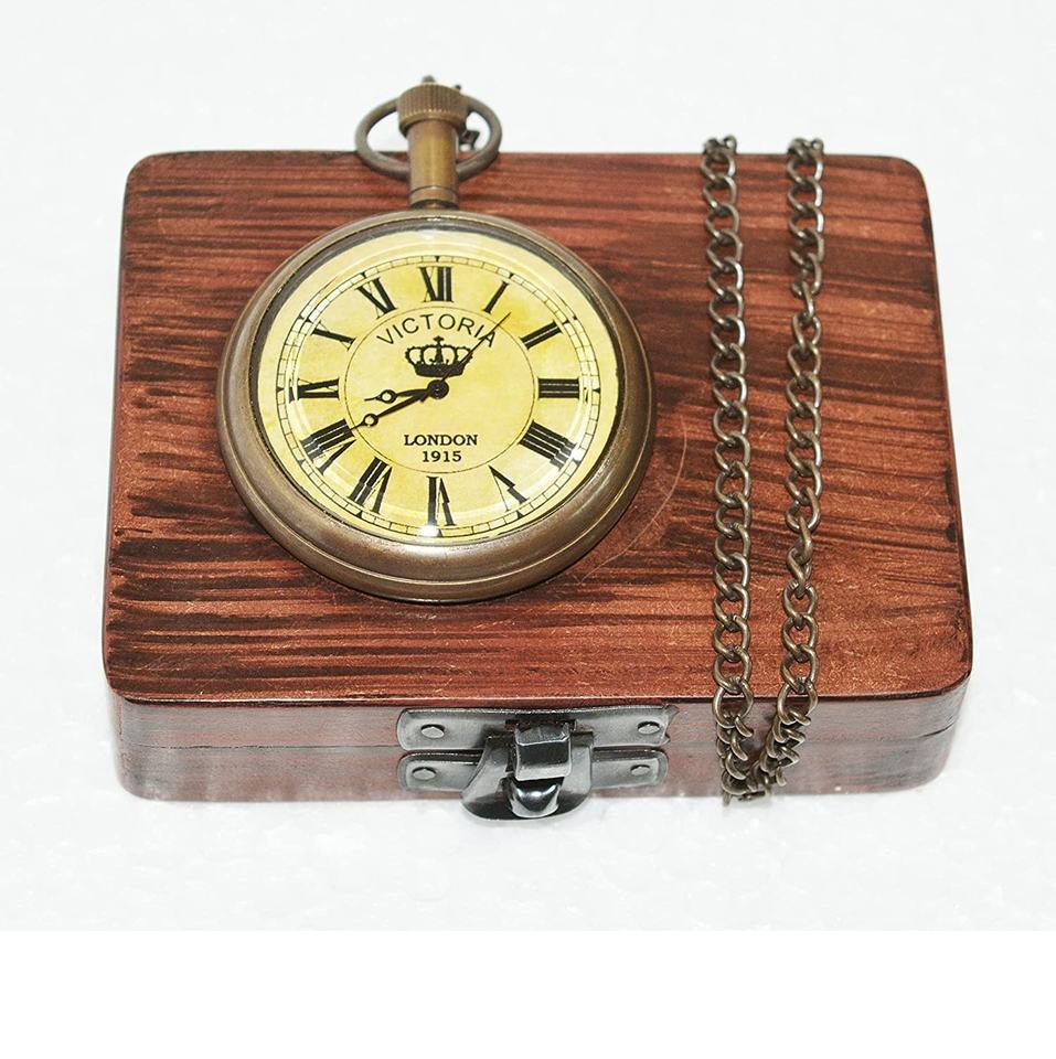 Brass Pocket Watch With Brown Wooden Box Nautical Handmade Pocket Watch With Chain Unique Pocket Watch for Sale