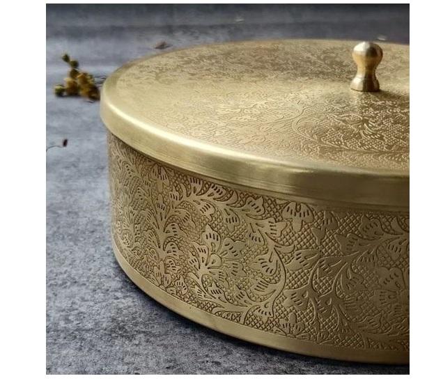 Brass Spices Box for Kitchen Handmade Golden Spices Container with Embossed Lid 7 Compartments and 1 Spoon Indian