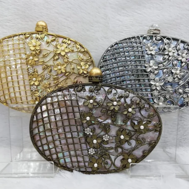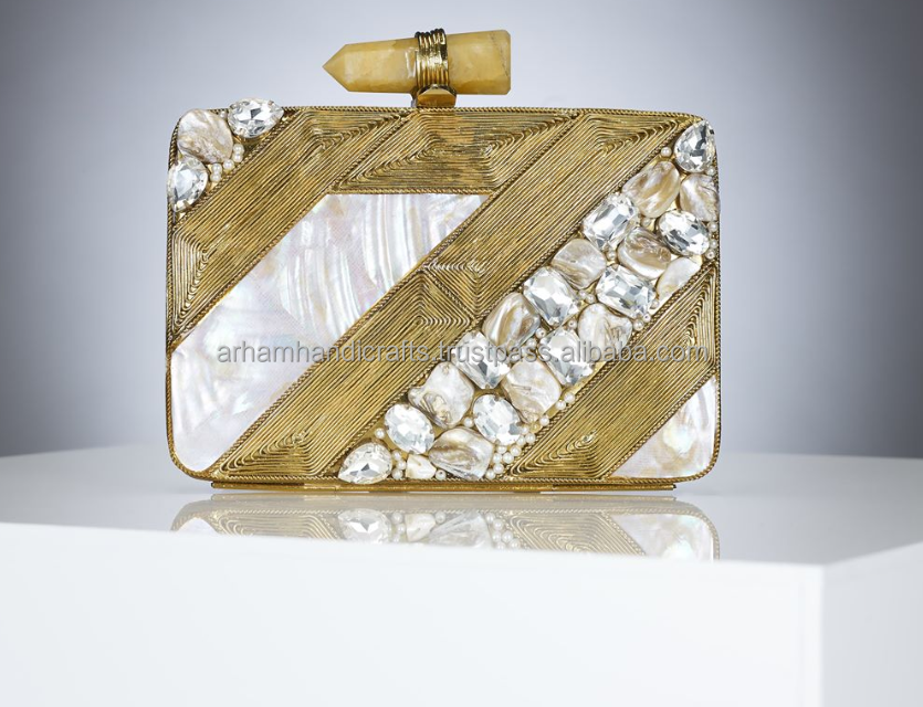 Manufacturer's Luxury Customizable Natural Brass MOP Clutch Bag for Women for Wedding Parties Evening Use Featuring Stone