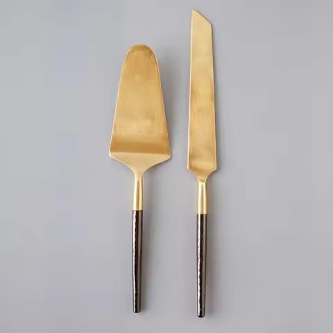 Brass cake server set brushed gold blade with black hammered two-tone handle