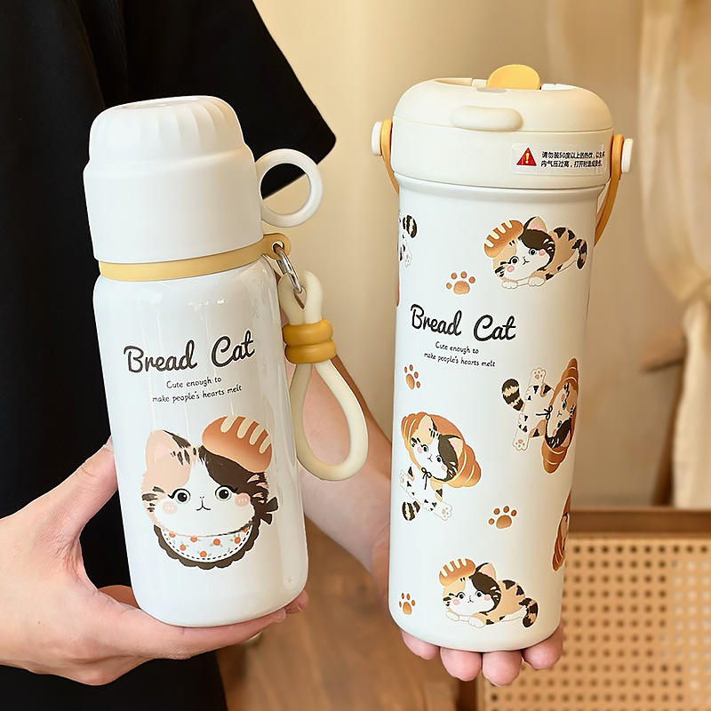 Bread Cat Insulated Round Water Bottle 316 Stainless Steel with Handle and Straw for Students Coffee Lovers & Back to School