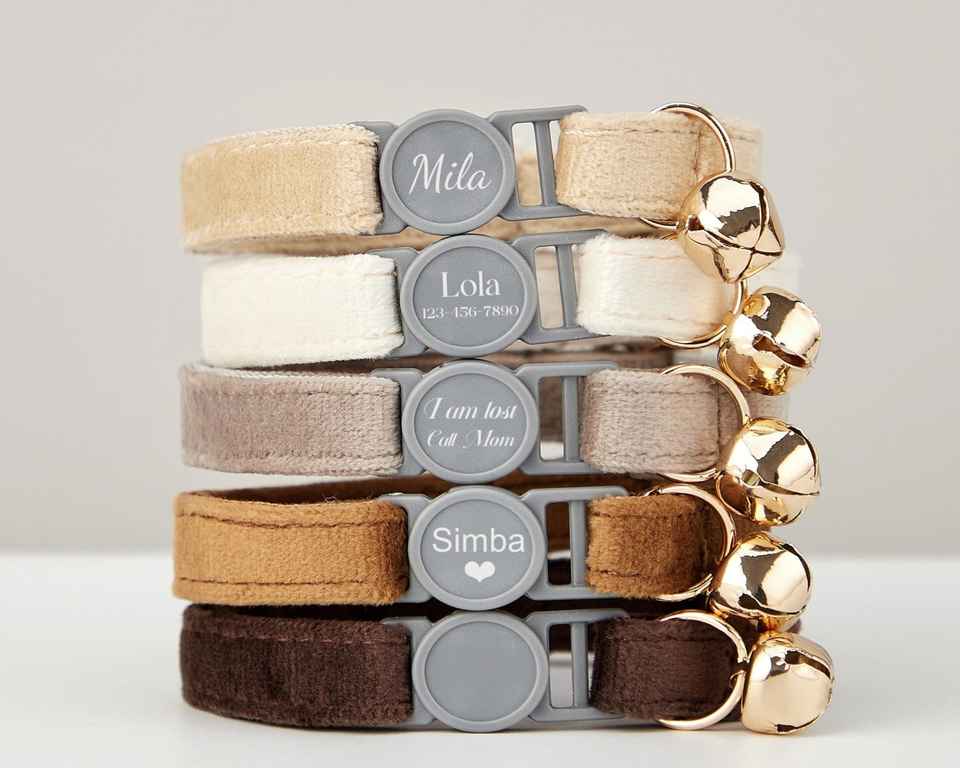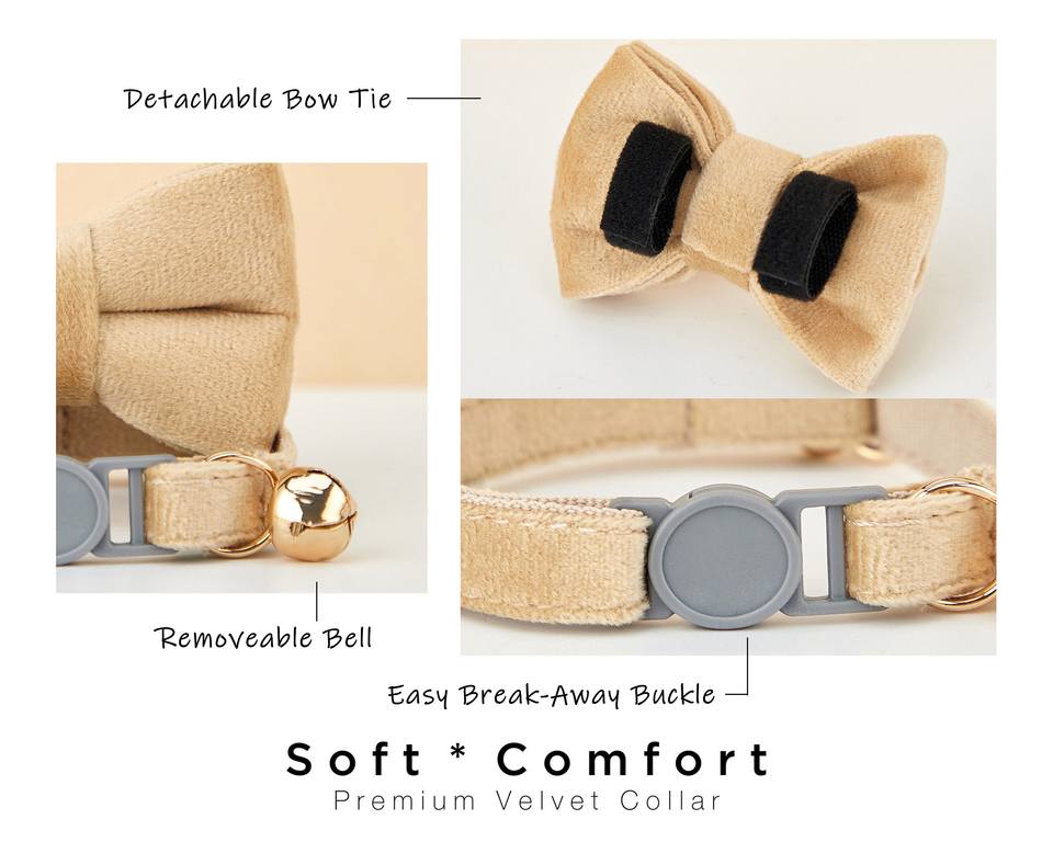 Breakaway Coffee+Beige+Grey Velvet Cat Collar Bowtie Leash Set,Personalized Engraved Kitten Name SafetyBuckle,Free Gold