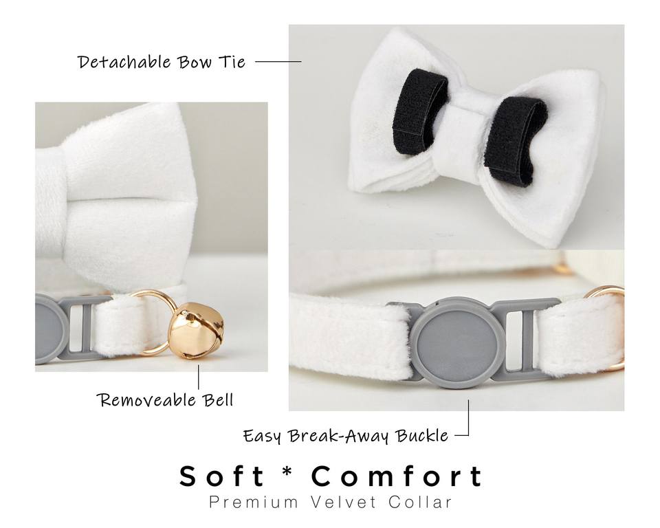 Breakaway White Veet Personalized Cat Collar Bow Tie Leash Set,Custom Engraved Kitten Name Safety Buckle,Free Gold Bell,Female