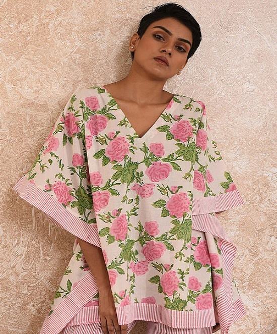 Breathable Cotton Loose Fit Pink Short Kaftan Night Dress With Striped Pink Comfy Pajama