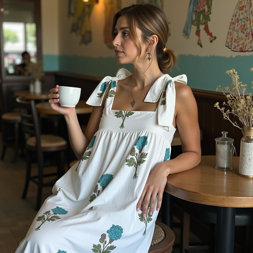 Breathable sleeveless resort dress with blue and green block print florals tied shoulder bows soft fabric drape and elegant