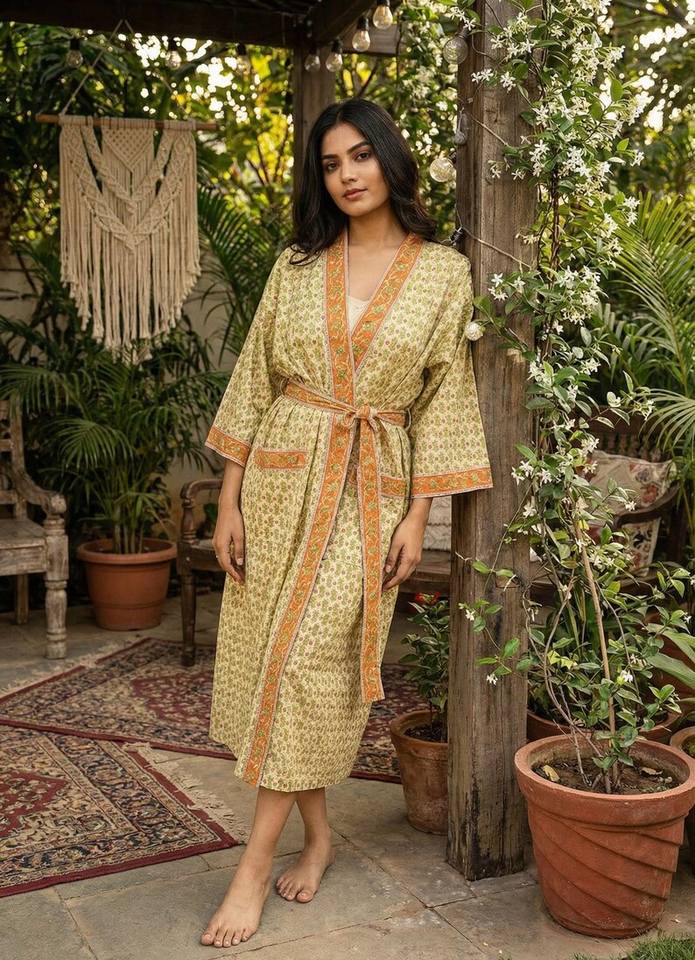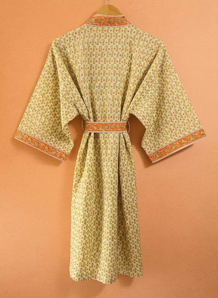 Bridal Cotton Kimono Robe Hand Block Print Orange Floral Trim Women Dressing Gown Lounge Wear