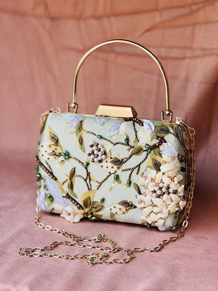 Bridal Fashion Floral Zardozi Silk Clutch Bag with Pearl Embellishments Indian Traditional Evening Purse for Wedding Festivals