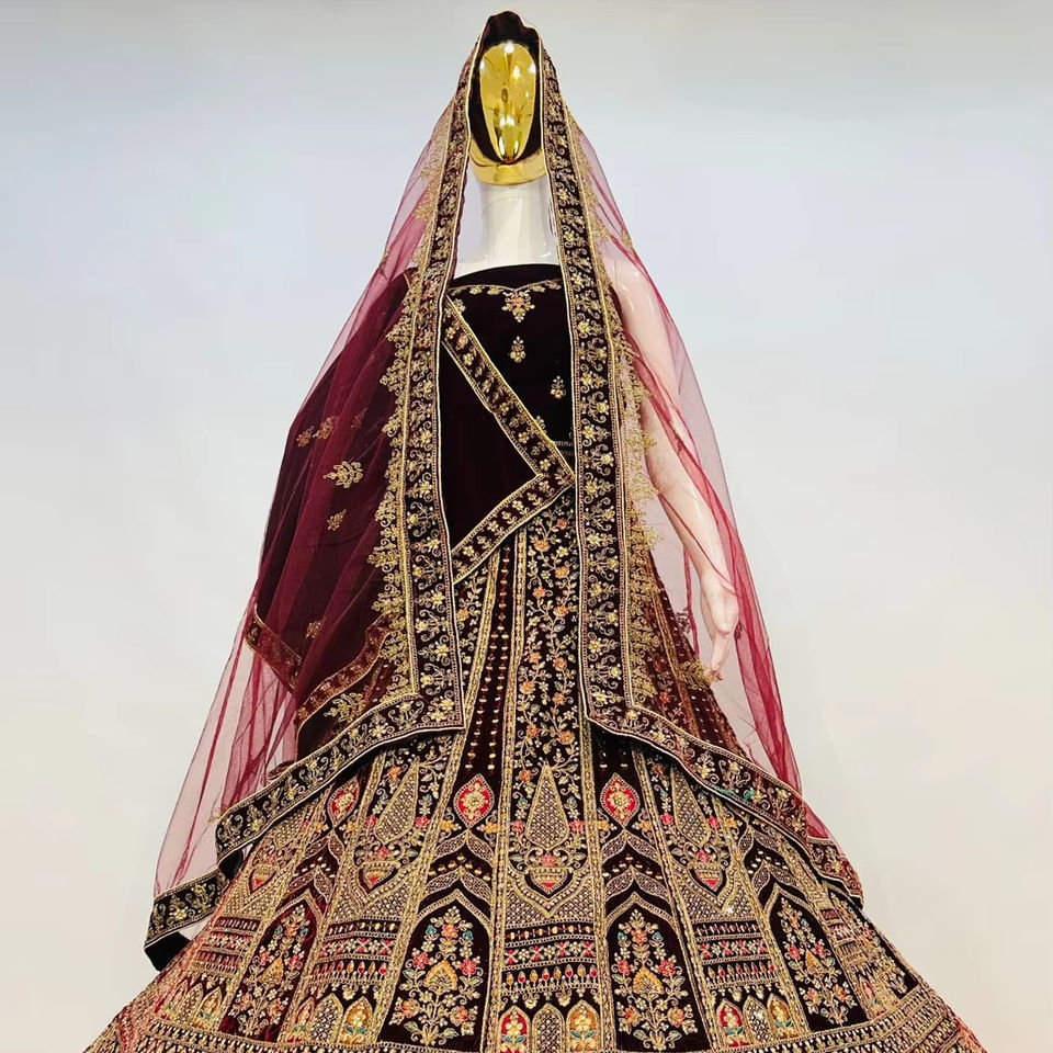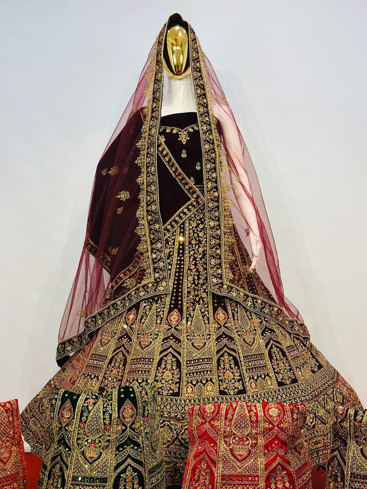 Bridal Favorite Velvet Lehenga Full Hand Mirror Jarkan Work Heavy Flair Long Blouse Dupatta Highly Demanded for Party Occasions