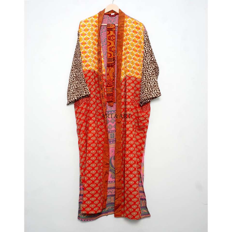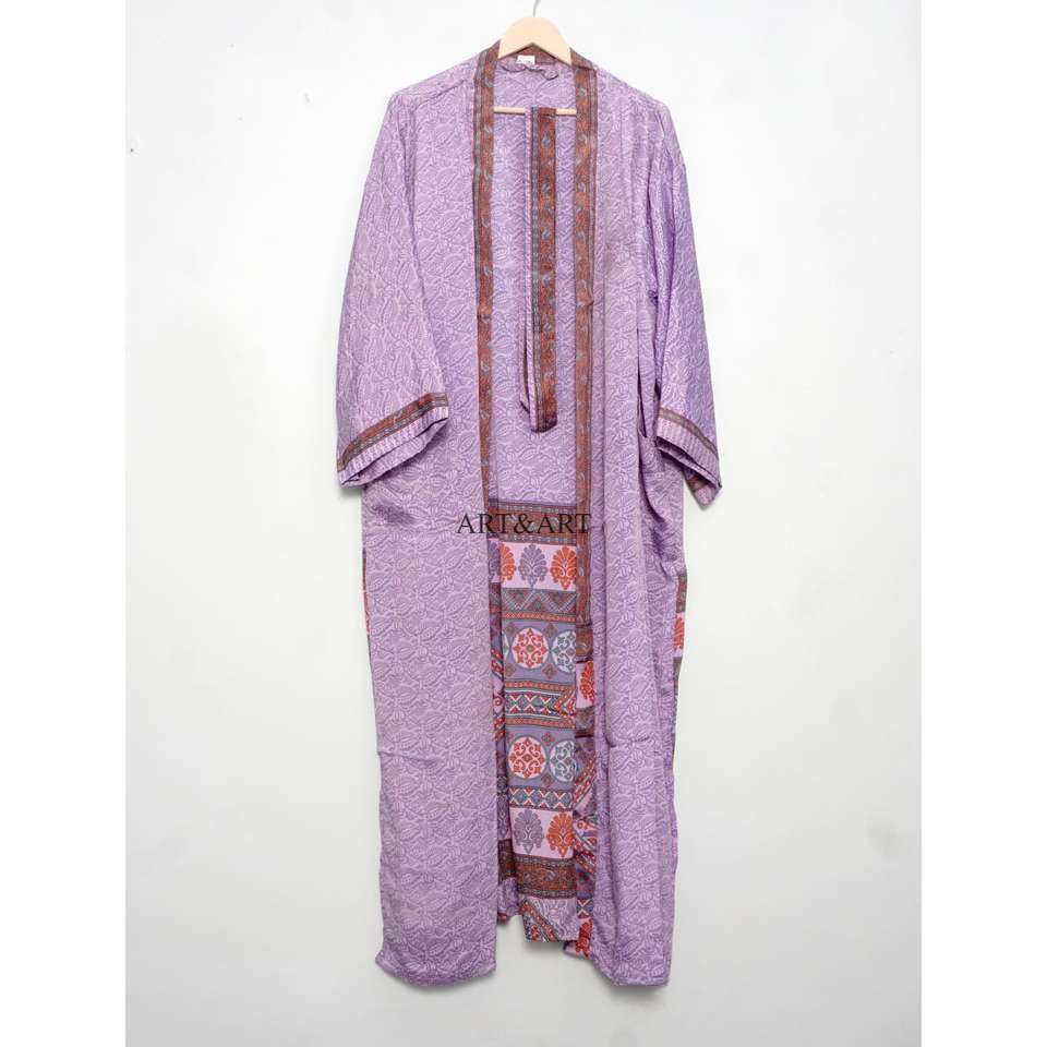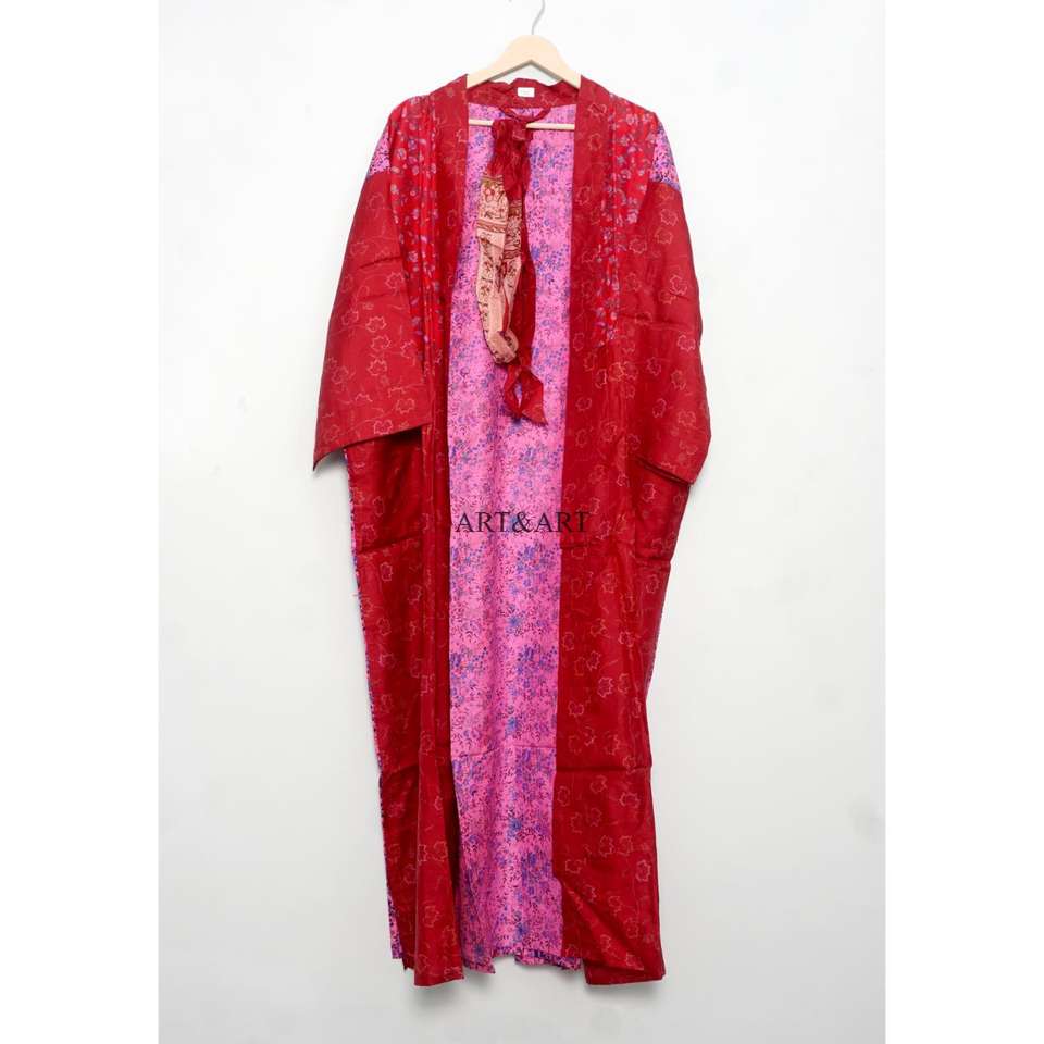 Bridal Robe Light Weight Breathable Silk V-neck Woman Night Wear Long Robe Floral Print Indian Vintage Recycled Silk Sari Kimono