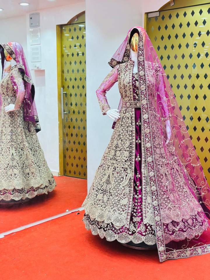 Bridal Velvet Lehenga with Full Jarkan Work Shrug, Heavy Dupatta & Belt Mastani Style Trending Winter Partywear Set