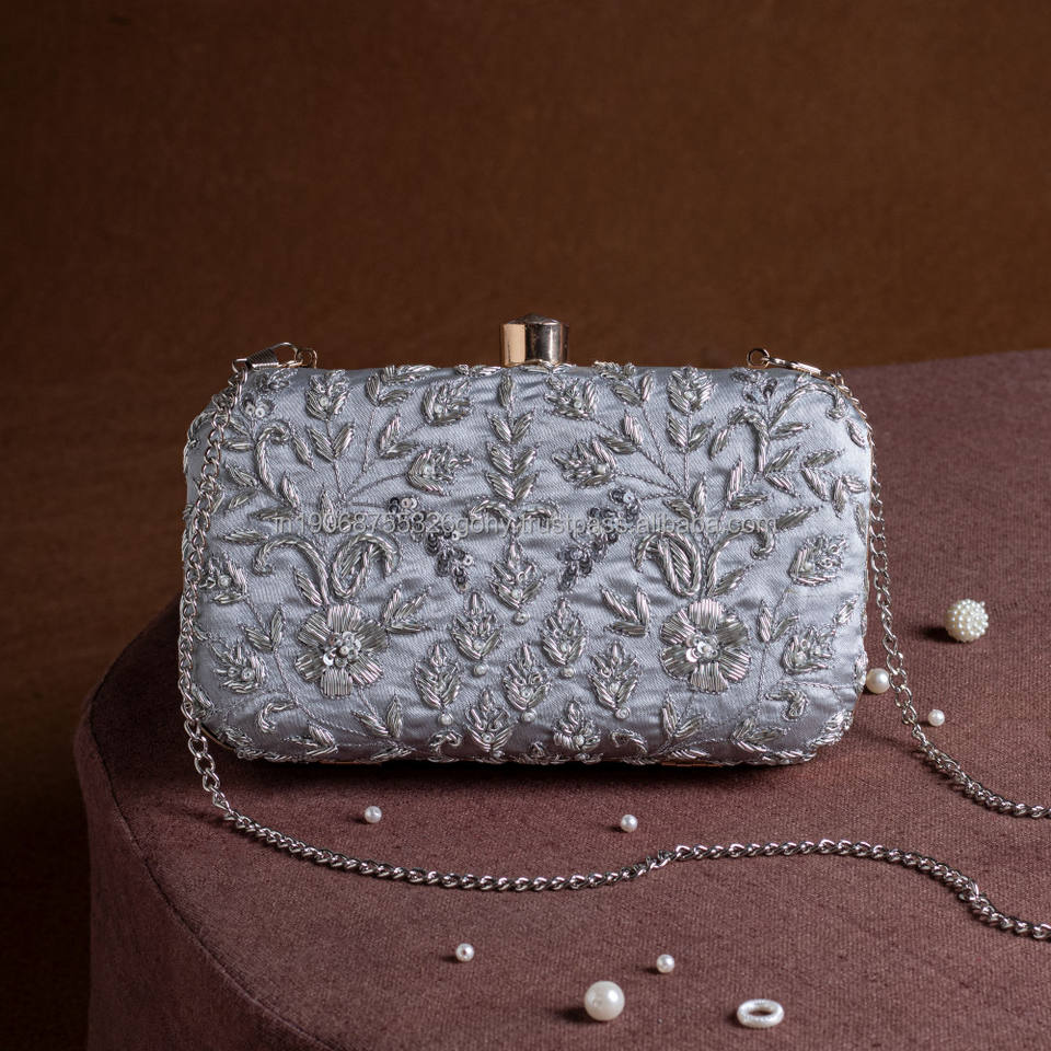 Bridal Zardozi Embroidered Half Moon Silk Clutch Bag with Golden Thread Work Classic Fashion Soft Indian Hand Purse
