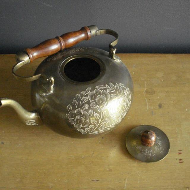 Bright Brass Kettle Vintage Brass Tea Kettle Teapot Floral Etched Design Lid and Feet Wooden Handle Made in India
