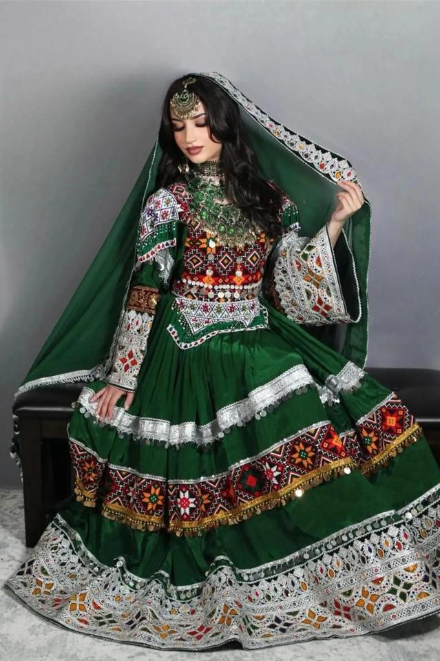 Bright Green Afghan Kuchi Style Dress With Colorful Geometric Mirror Embroidery Traditional Silver Jewelry Long Flowy Skirt