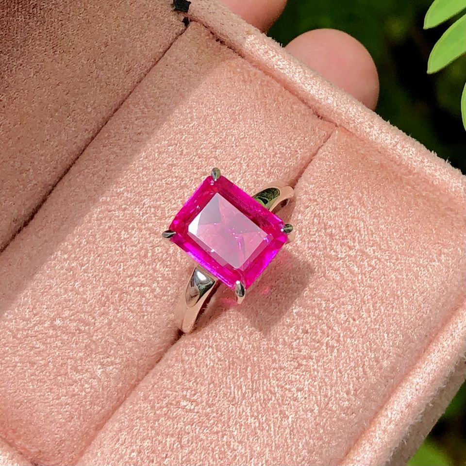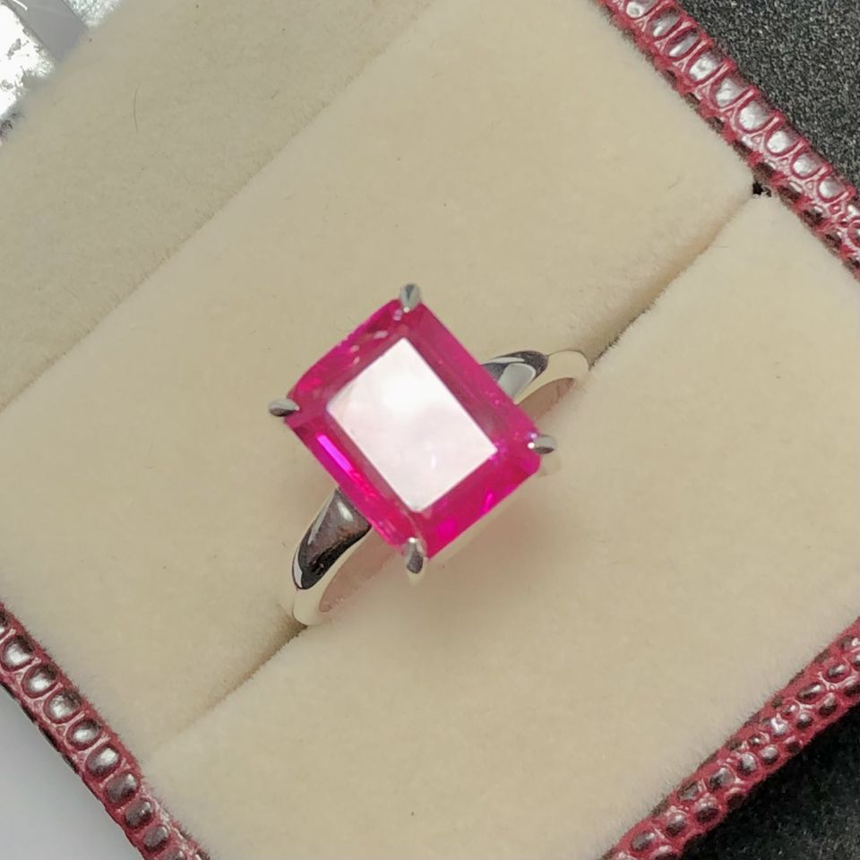 Bright Pink Sapphire & White Sapphire Sterling Silver Ring Size 5 6 7 8 9 10 Emerald Cut Pink Sapphire Ring Jewelry Gift Wife