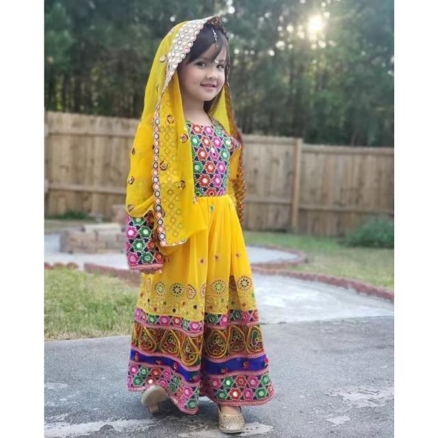 Bright Yellow Traditional Afghan Dresses With Detailed Mirror Work And Colorful Borders For Mother And Daughter