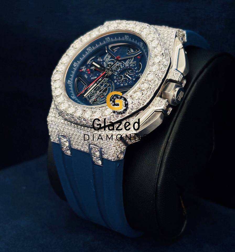 Brilliant Cut VVS Clarity DEF Color Moissanite Diamond Personalized Blue Silicon Strap Hip Hop Style Analog Display Glass