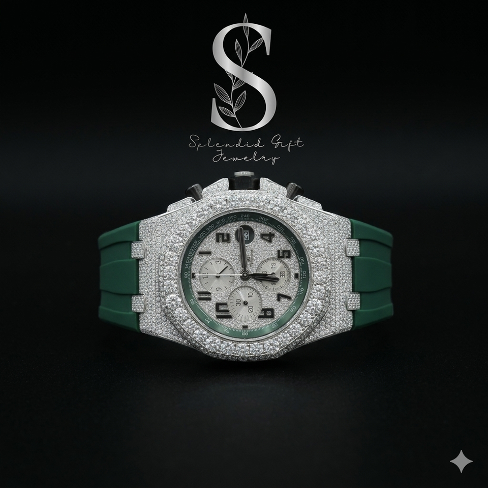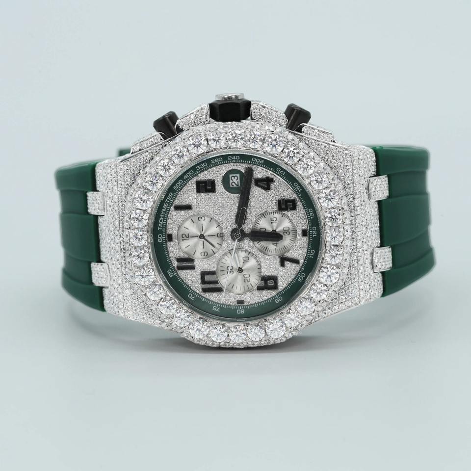 Brilliant Natural Diamond Luxury Watch Solid 925 Sterling Silver and Greean Color Rubber Band Watch for Men's