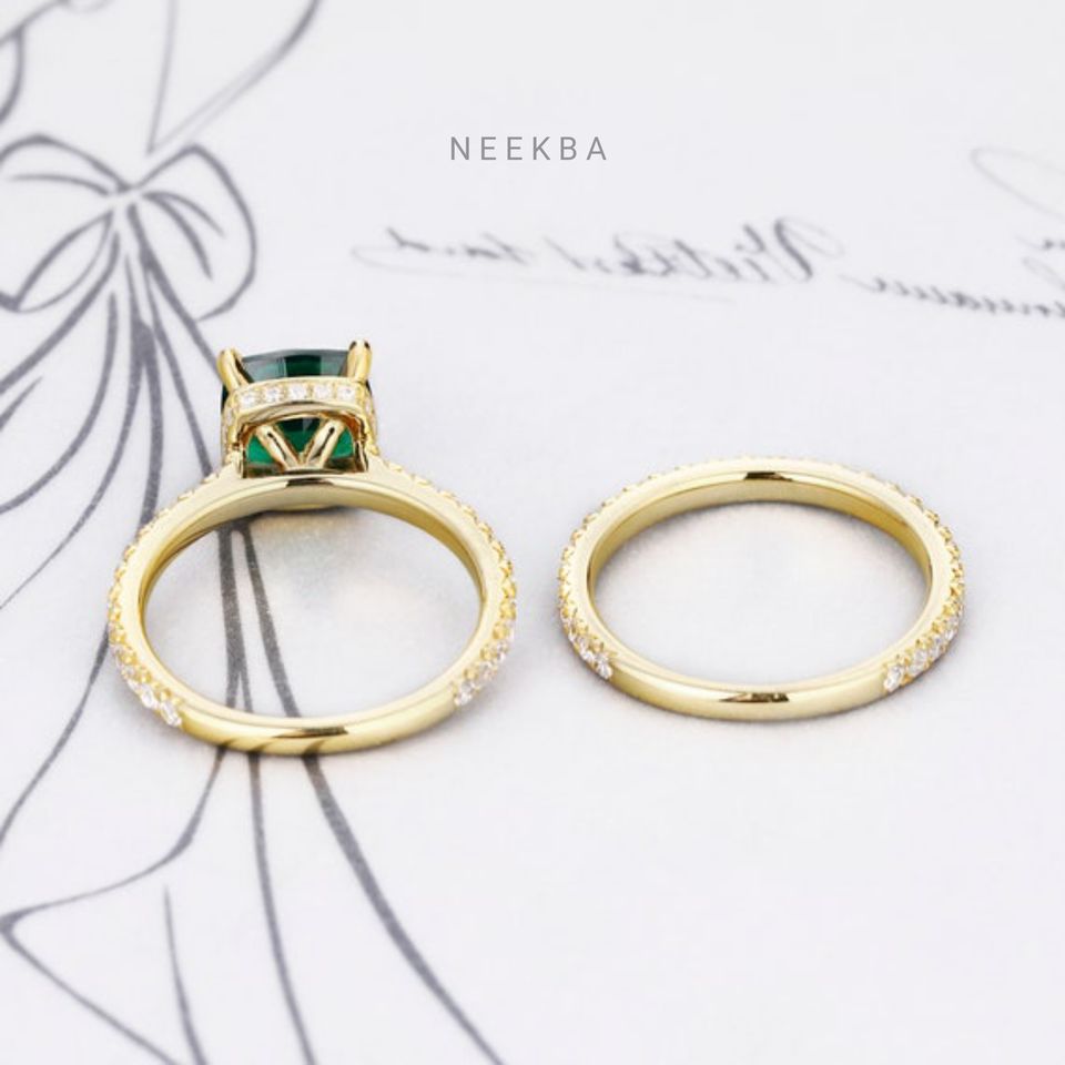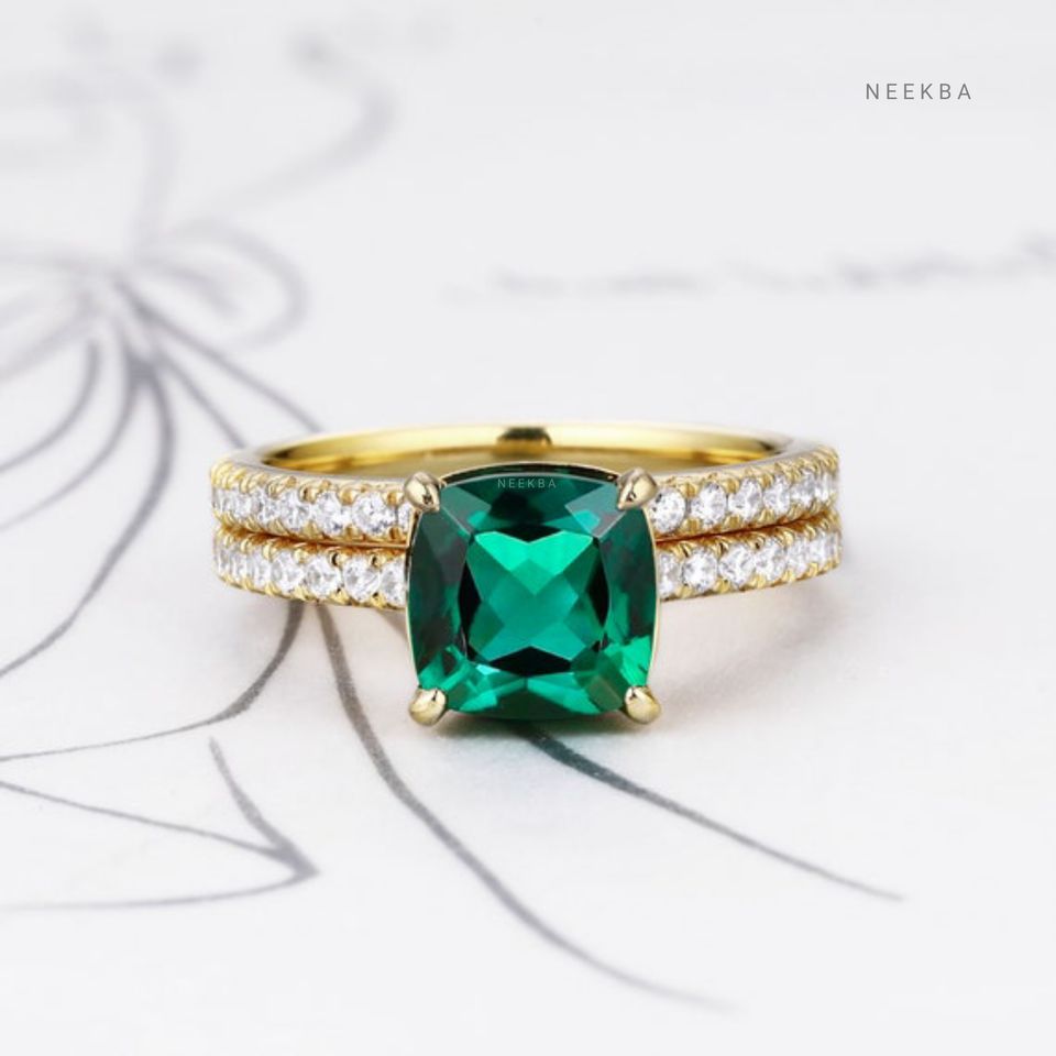 British Design 2-Piece Bridal Ring Set - Cushion Cut Lab-Grown Emerald Engagement Ring Paired with Stacking Band in 925 Silver