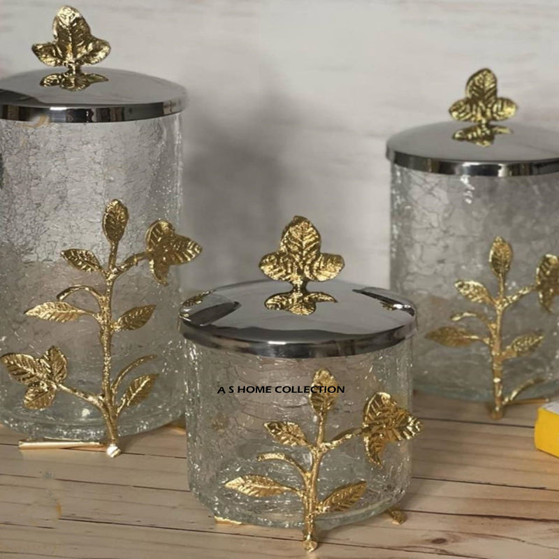 Broken Glass Calla Lily Design Hammered Texture Golden Base With Silver Lid Luxury Home Kitchen Storage Round Jar Canister