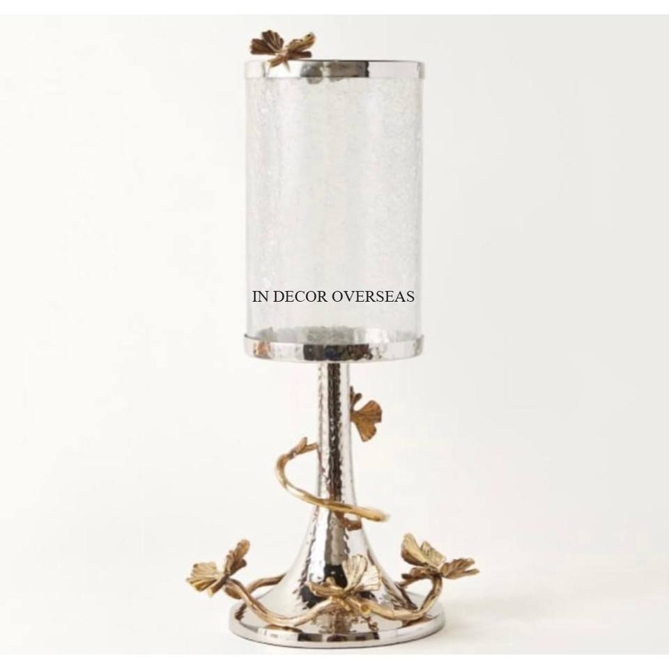 Broken Texture Clear Glass With Hammered Texture Silver Shiny Polished & Gold Plated Butterfly Design Metal Stand Candle Holder