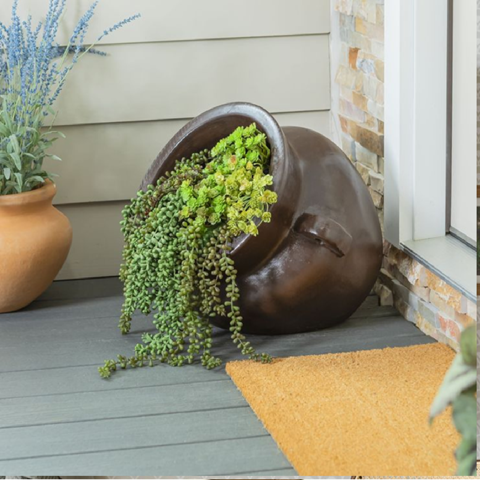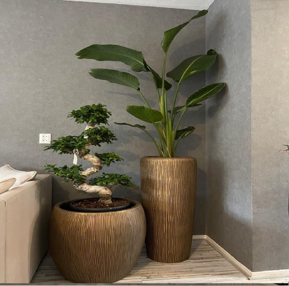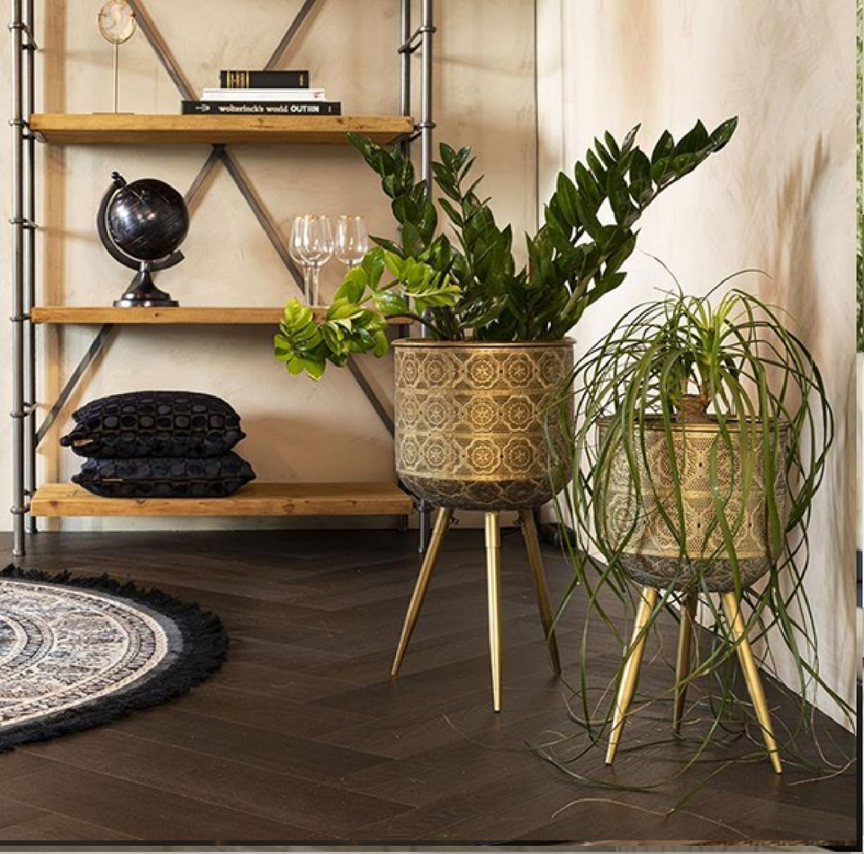 Bronze metal planters on tripod stands, elevated design, modern indoor pots, sleek, available at wholesale prices.