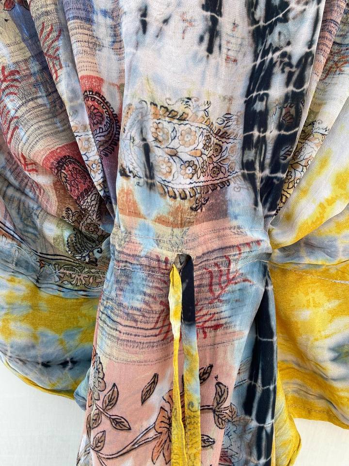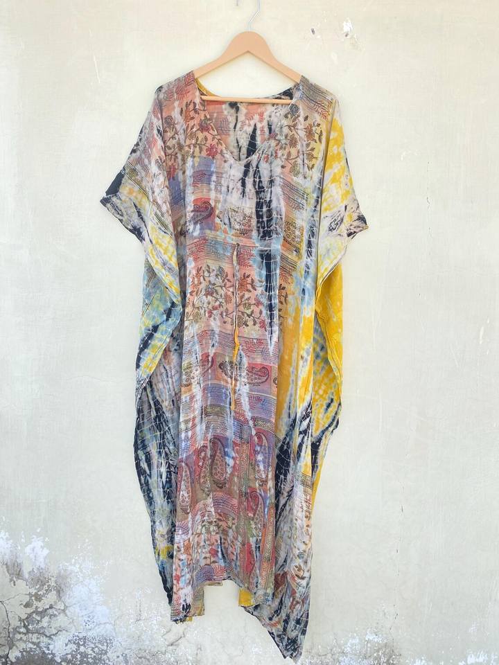 Unisex Brown and Yellow Silk Kaftan Vintage Tie Dye Kaftan Dress for Daily Life in Summer Autumn Spring