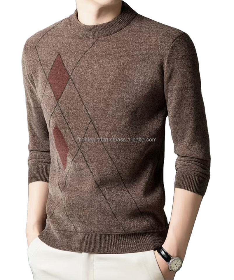 Brown Argyle Sweater for Men Casual Winter Wear Soft Wool Knitwear Long Sleeve Round Neck Pullover Stylish Comfortable Outfit