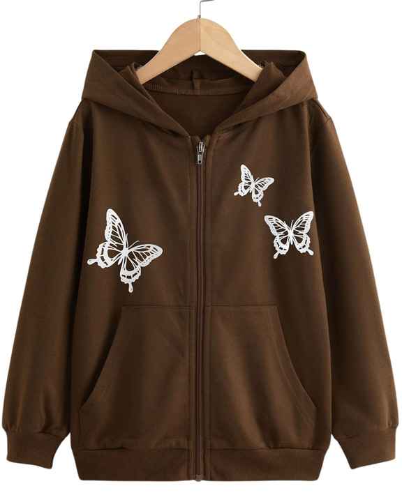 Brown Butterfly Print Zip Up Hoodie Women Oversized Streetwear Hooded Sweatshirt Casual Winter Fashion Jacket