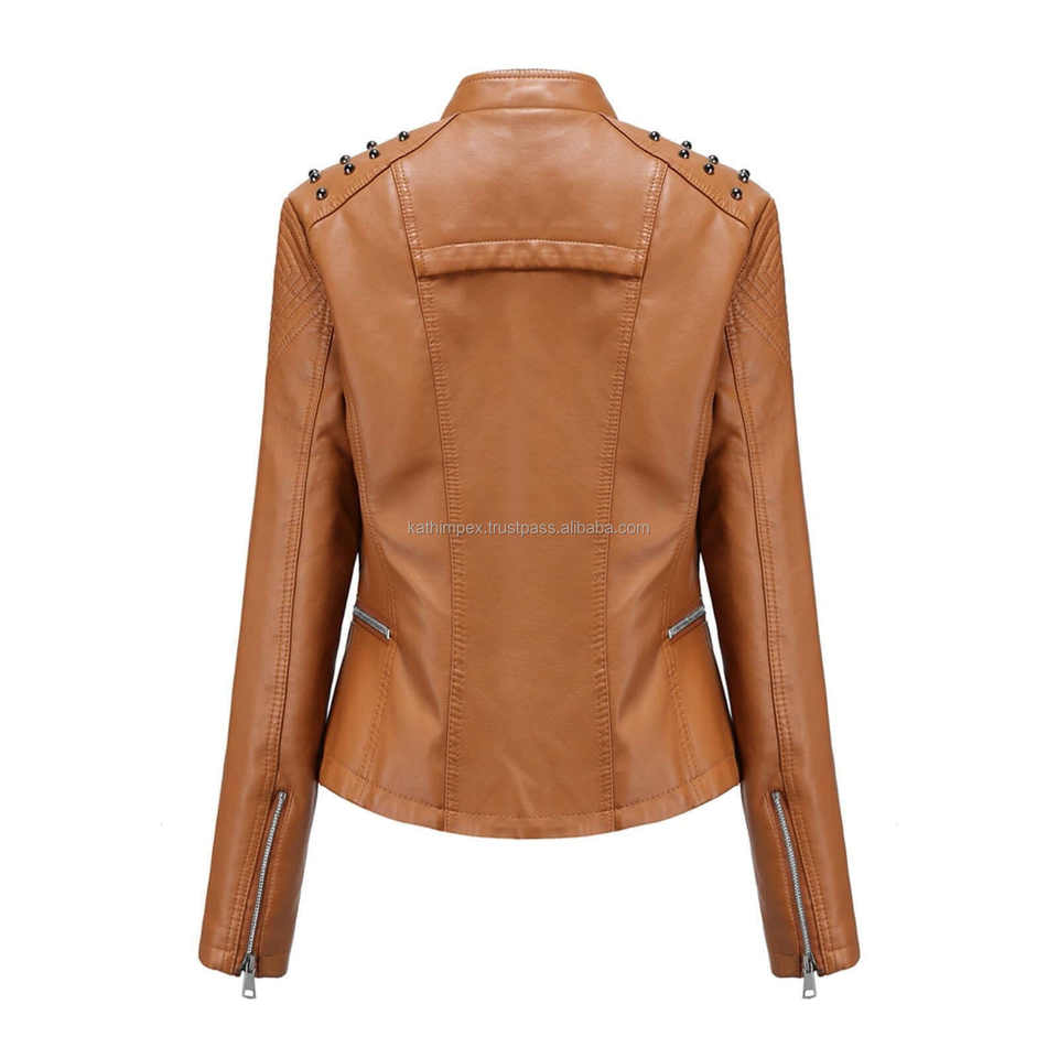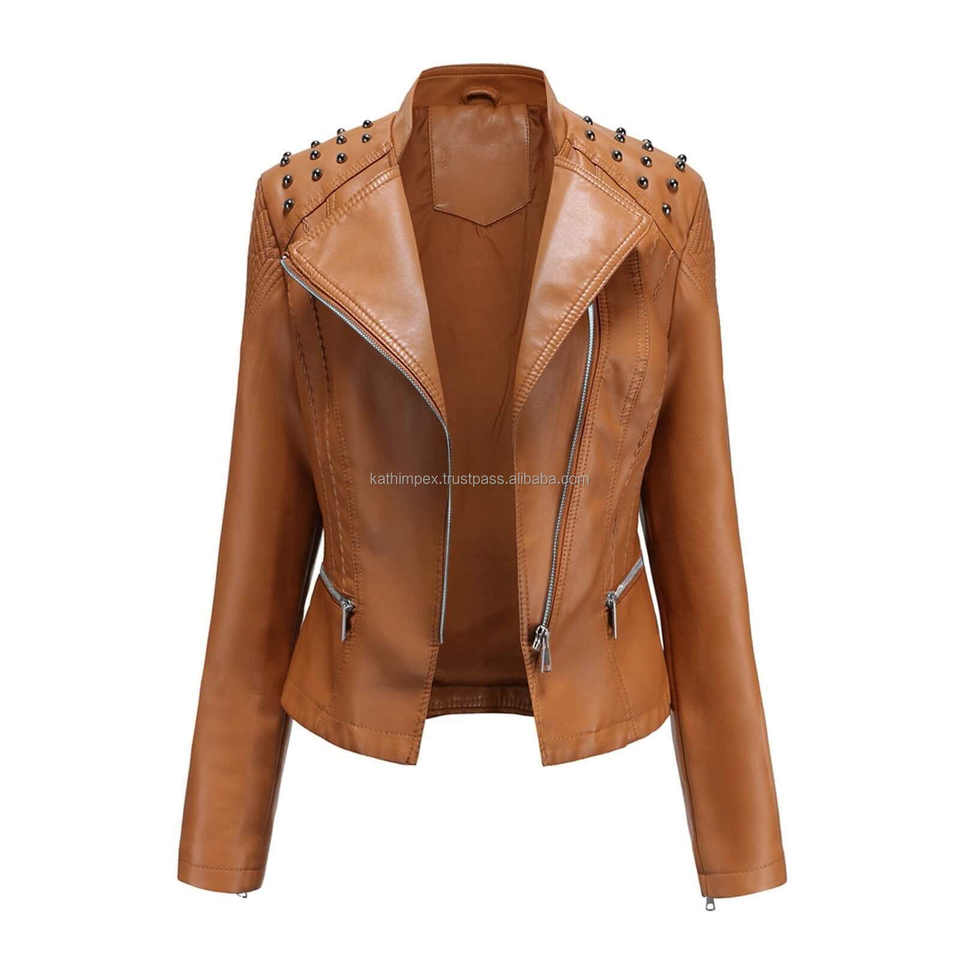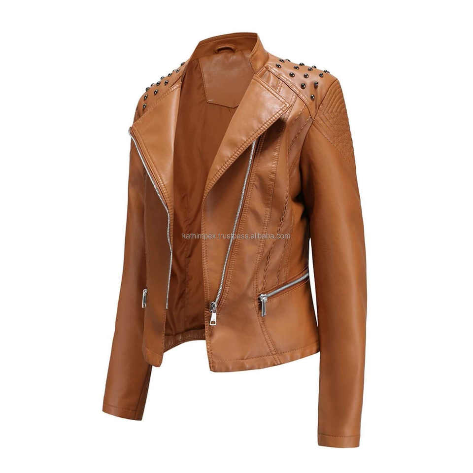 Brown Casual Biker Style Leather Women's Jackets with Round Studded Shoulders Slim Fit Asymmetrical Zipper and Pockets