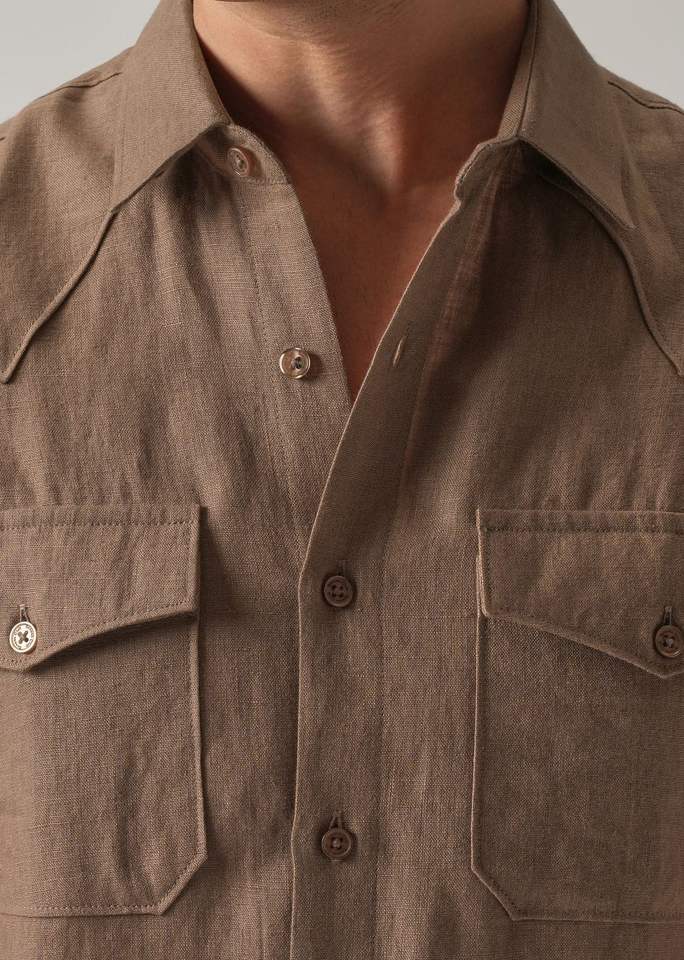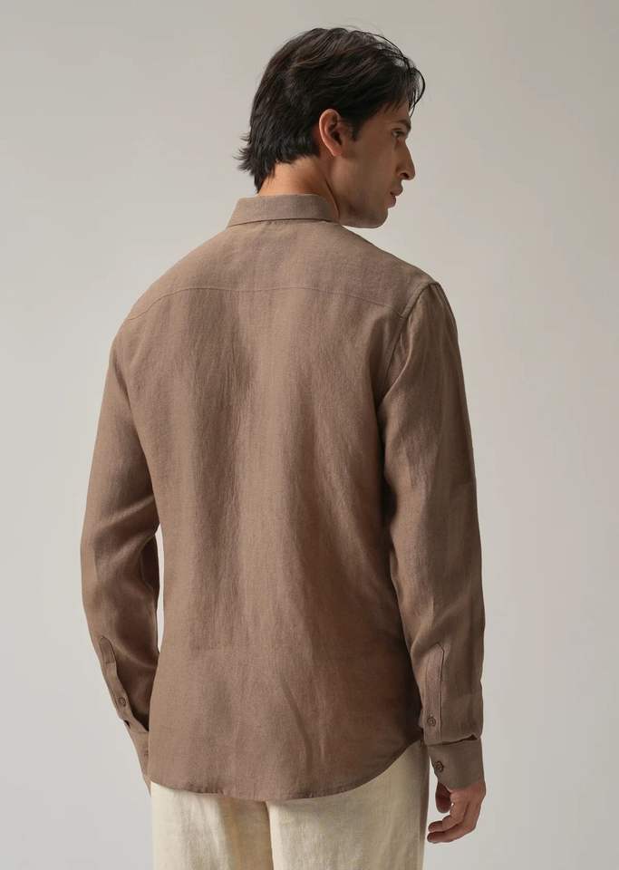 Brown Double Pocket 100% Pure Irish Linen Shirt Long-Sleeved Turn-down Collar Vintage Office & Business Style Men's Shirt