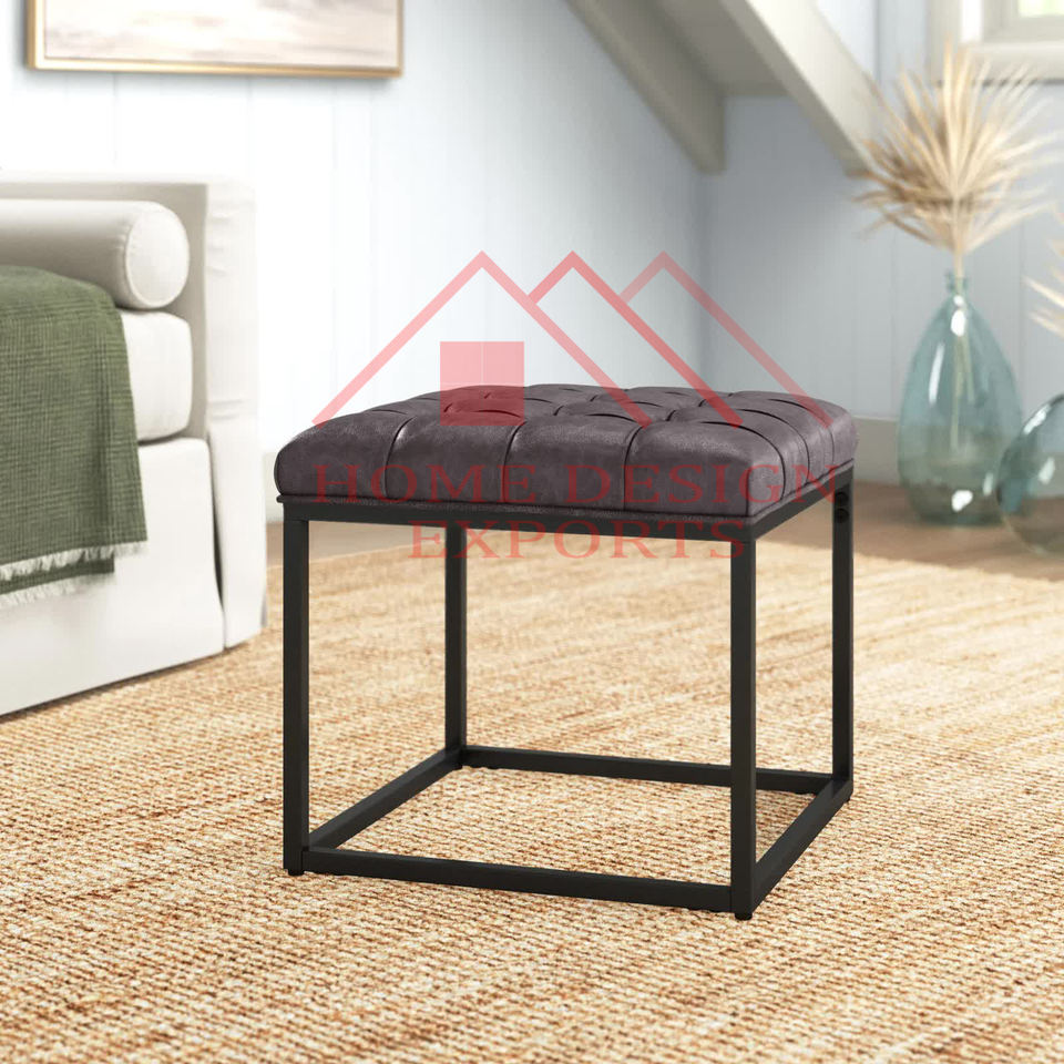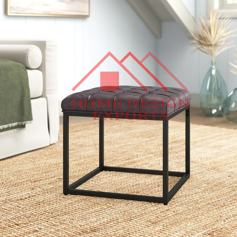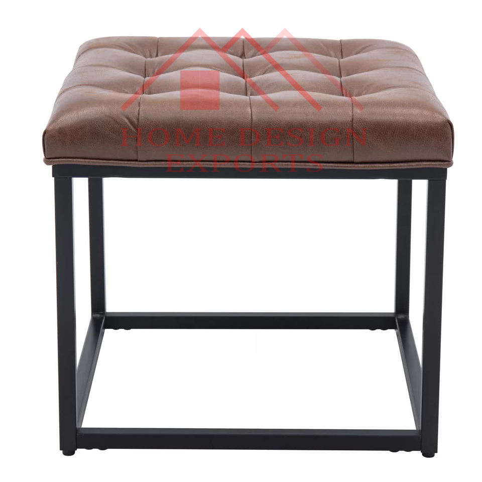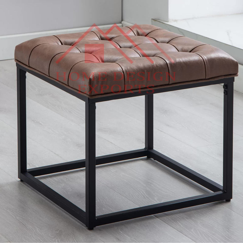 Brown Leather Hand Tufted Seat Ottoman Stool with Soft Fabric seating