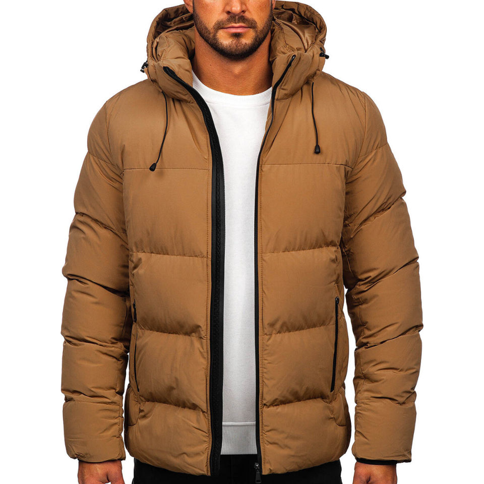 Brown Men's Quick Dry Streetwear Stand Collar Comfortable Hooded Puffer Jacket Winter Wind Breaker Polyester Fiber