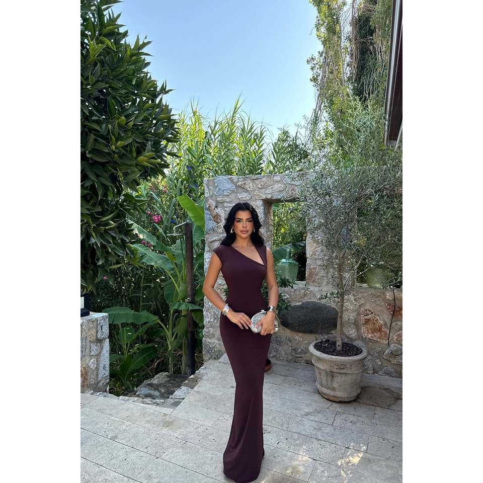 Brown One-Sleeve Ball Gown Evening Dress Formal & Party Style with High Collar & Floral Decoration Sizes XS & XL