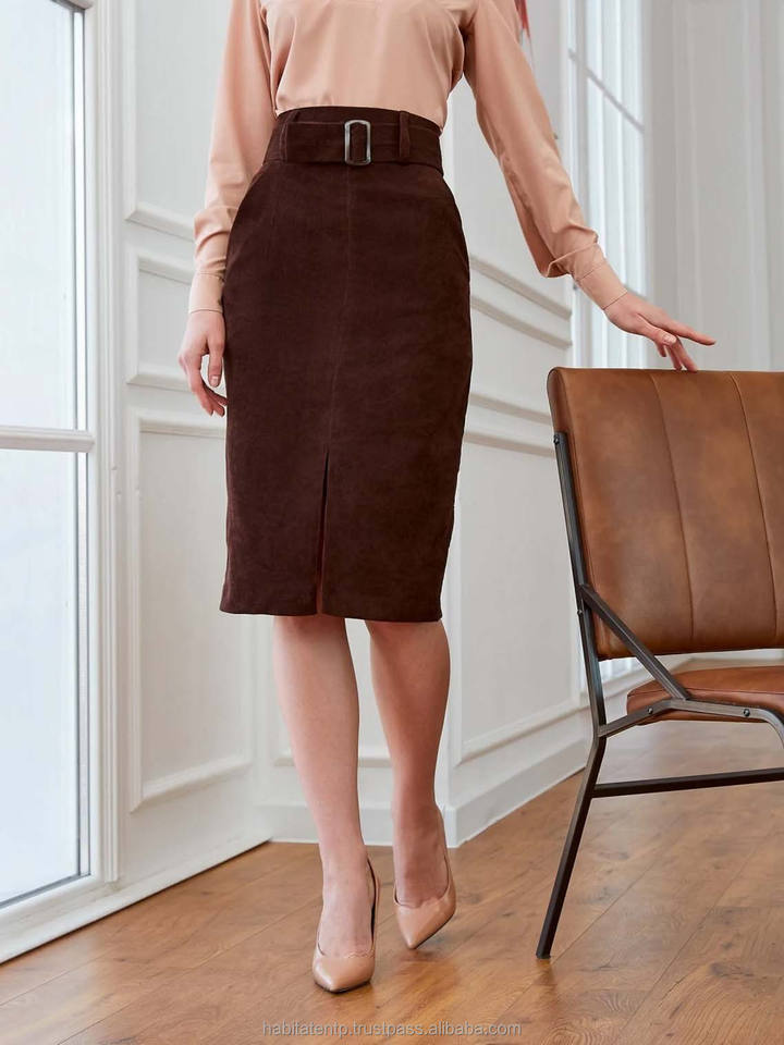 Brown Pencil Skirt for Women Knee Office Velveteen Skirt High Waist Secretary Classic Beige Cotton Skirt