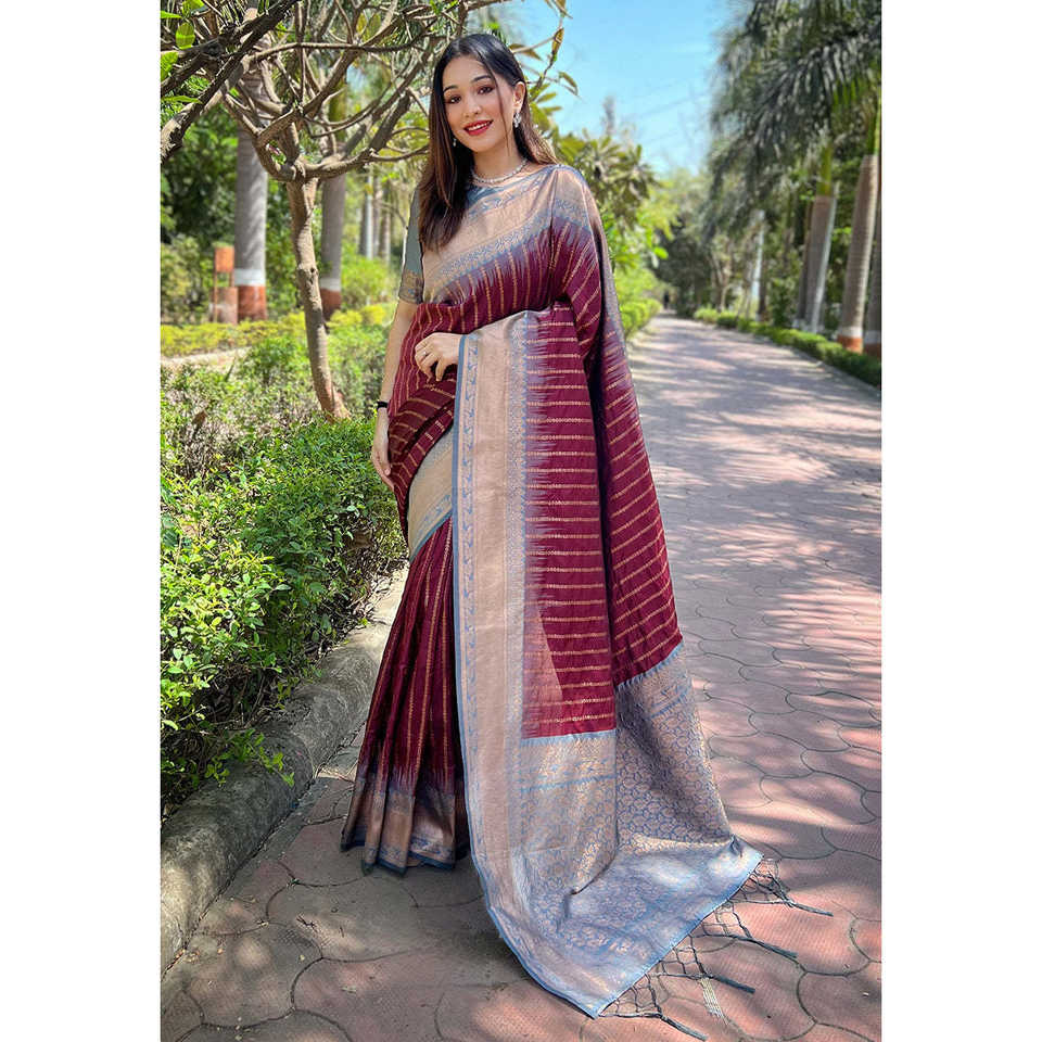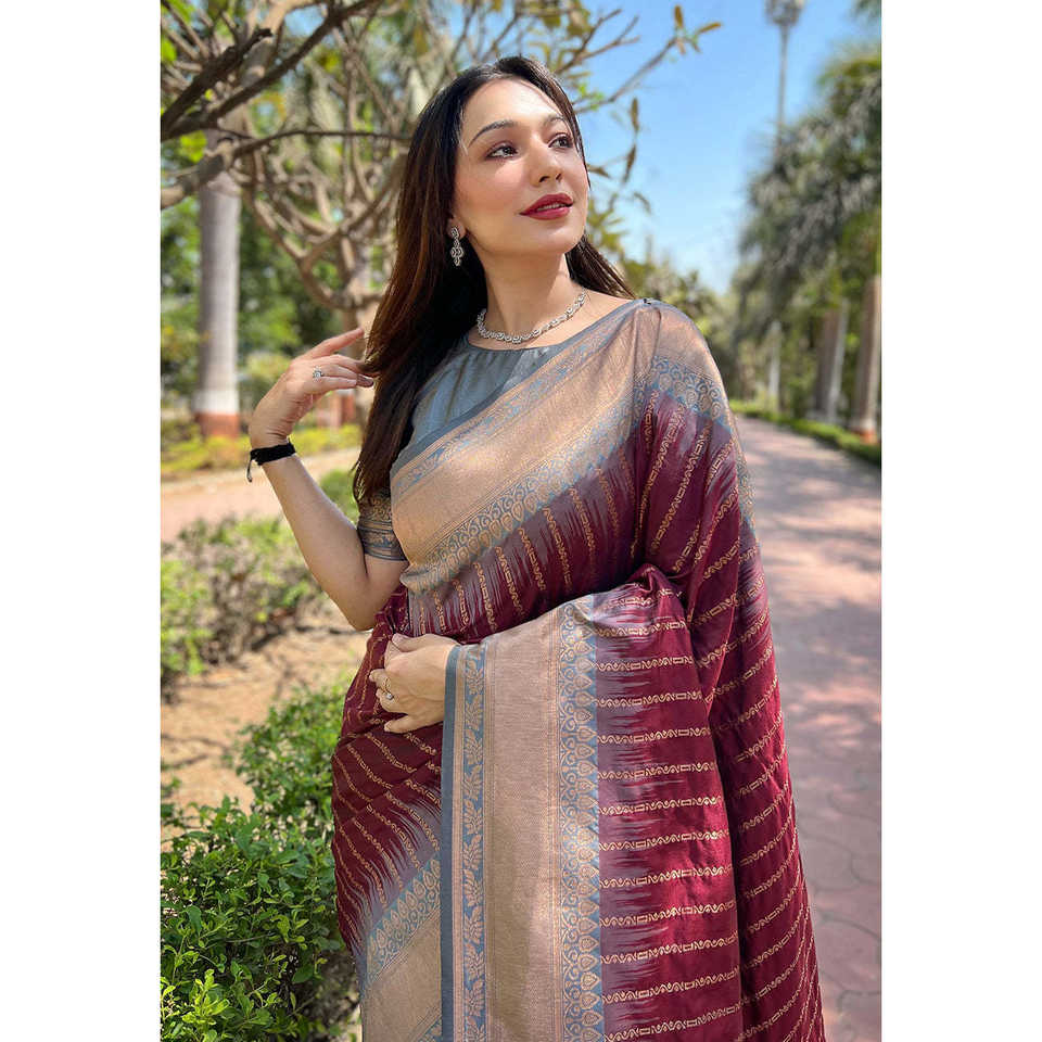 Brown Soft Silk Floral Border Saree with Zari Woven Contrast for Cocktail Dresses