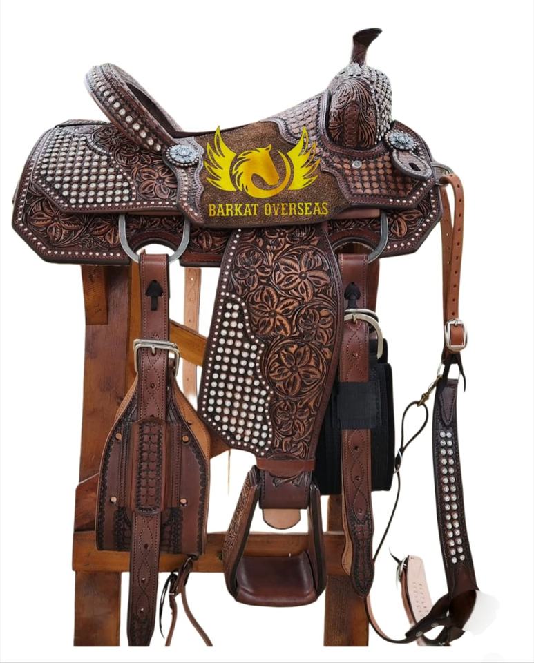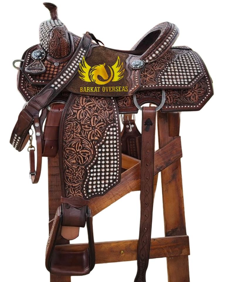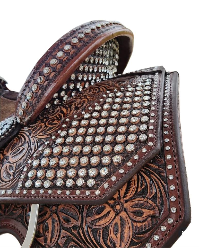 Brown Tooled with Crystal Rhinestones Roping Western Horse Leather Show Saddle Portable and durable with Soft Gel padded seat