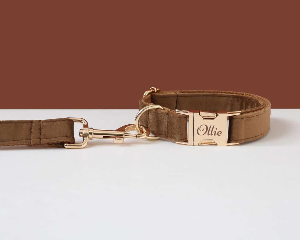 Brown Veet Bow Tie Set, Personalised With Name,Custom Boy Puppy Collar And Lead For Girl Dog