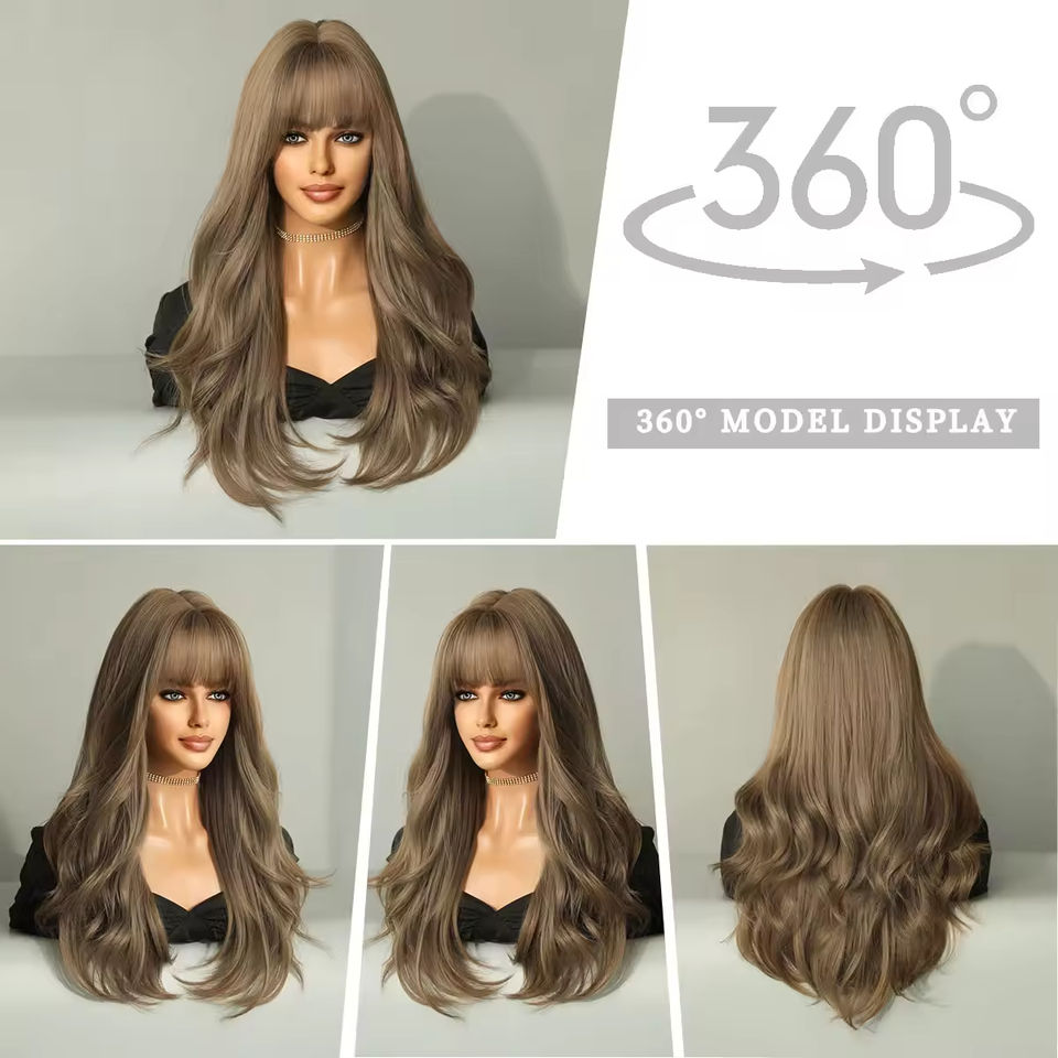 Brown Body Wave Wig Bangs Women Shoulder Length High Temperature Fiber Synthetic Factory Kinky Curly Crochet