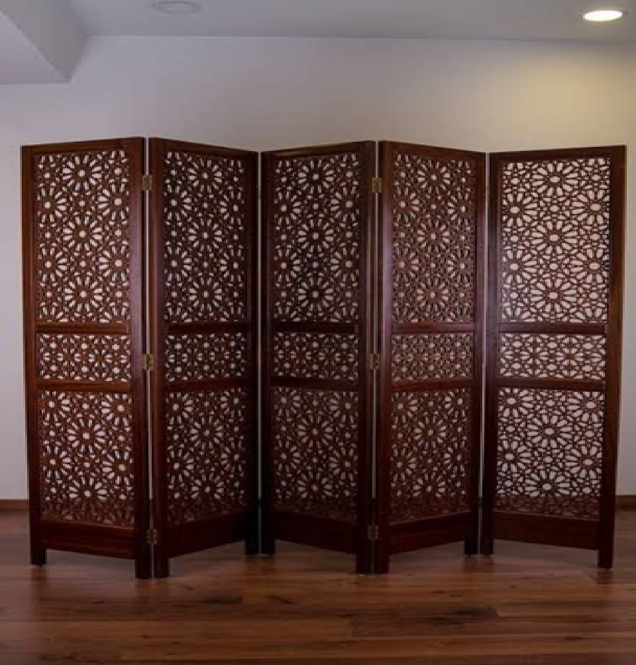 Brown carved wood room divider, ornate floral patterns. Traditional privacy screen, available at wholesale prices.