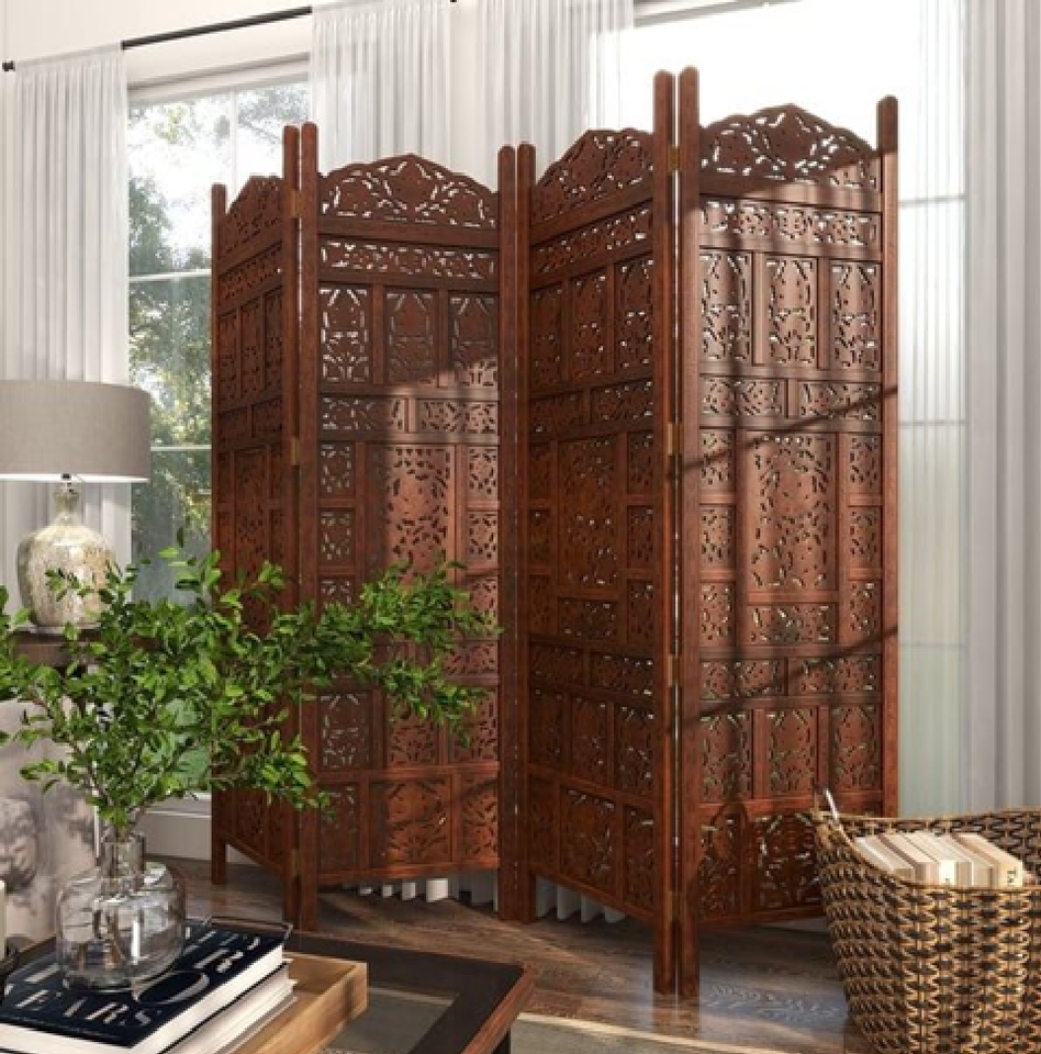 Brown carved wooden room divider, ornate floral details. Privacy screen, home accent, available at wholesale prices.