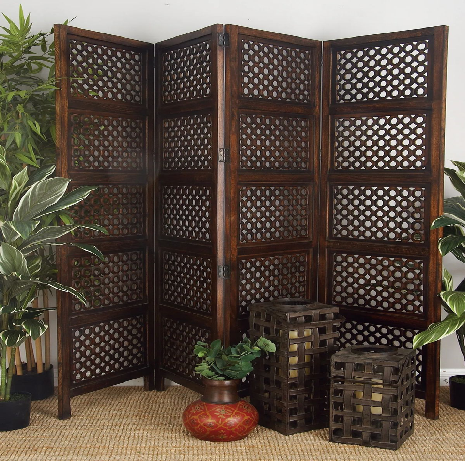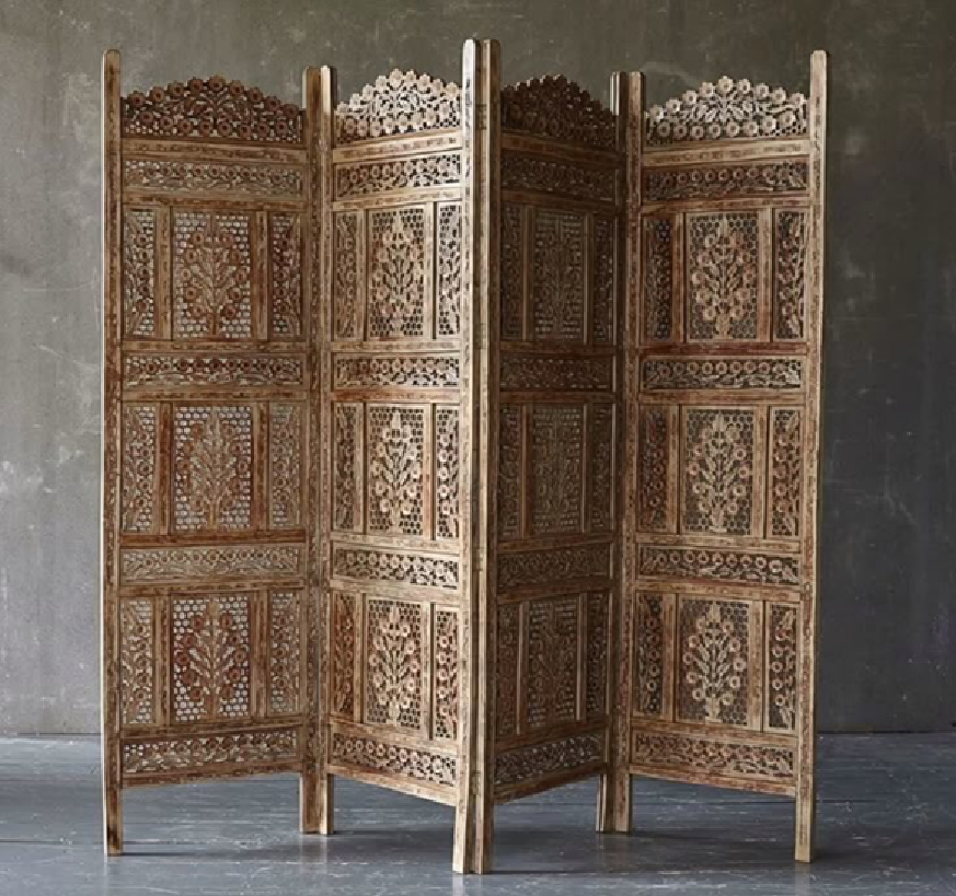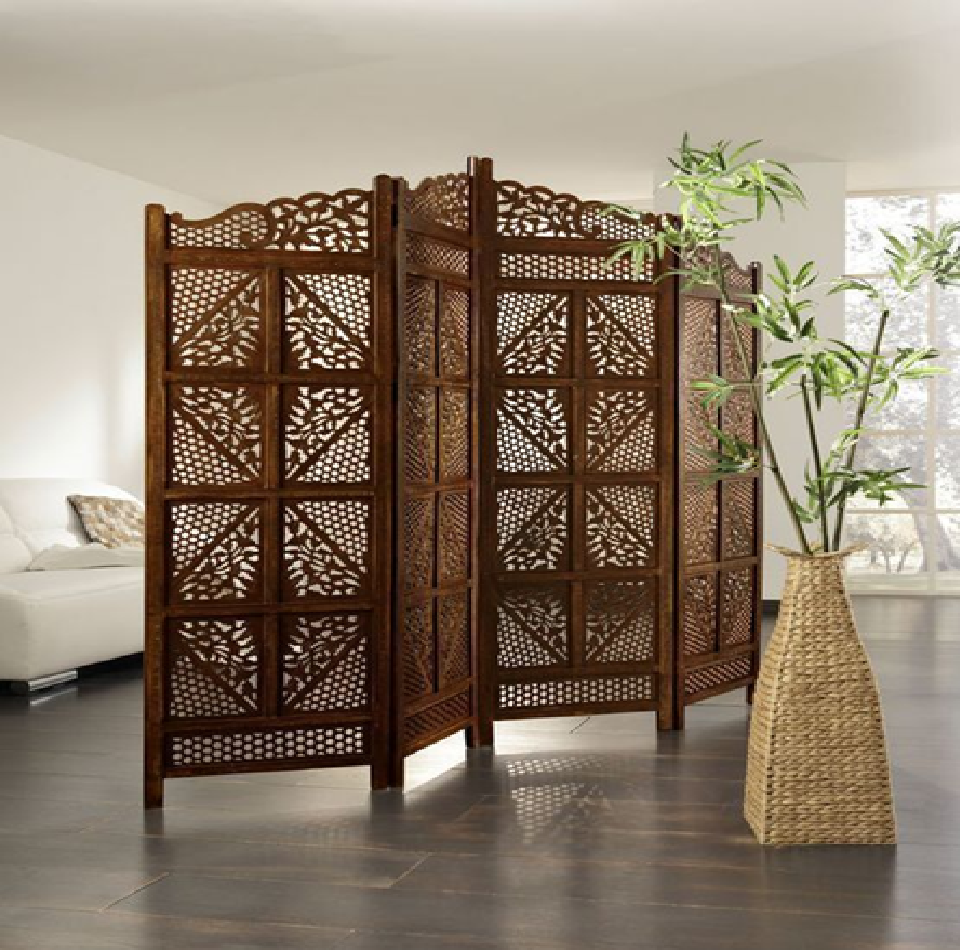 Brown carved wooden room divider, ornate design. Bedroom partition, home decor, available at wholesale prices.