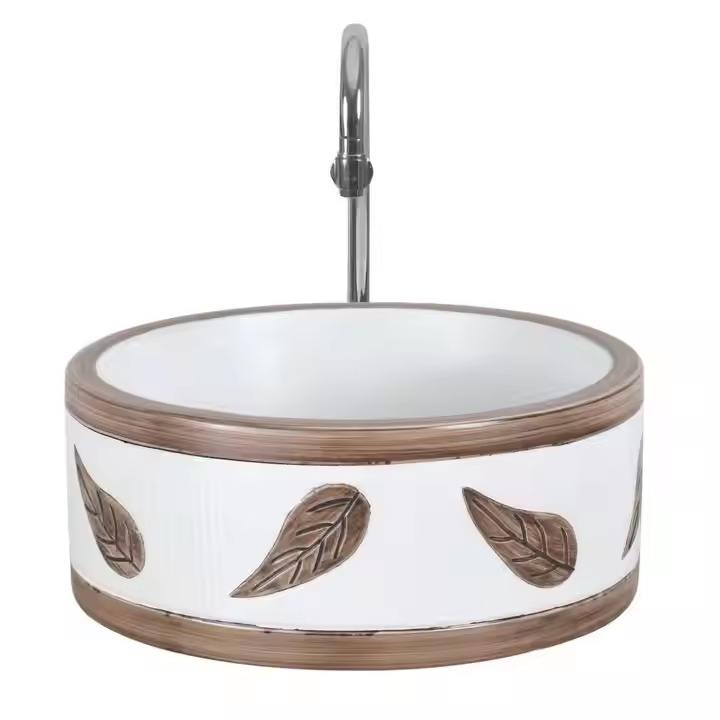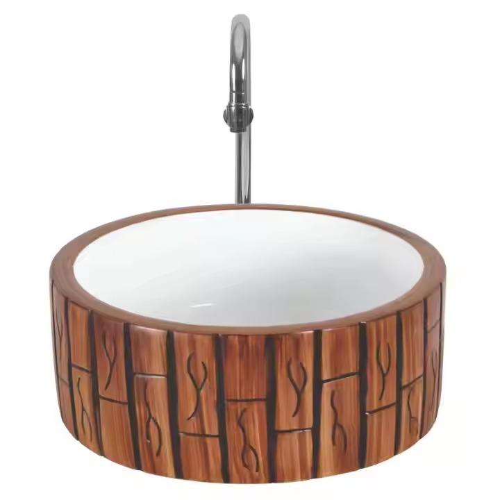 Brown printed round table top basin lavabo China wholesale ceramic hotel small round washbasin countertop basin for bathroom