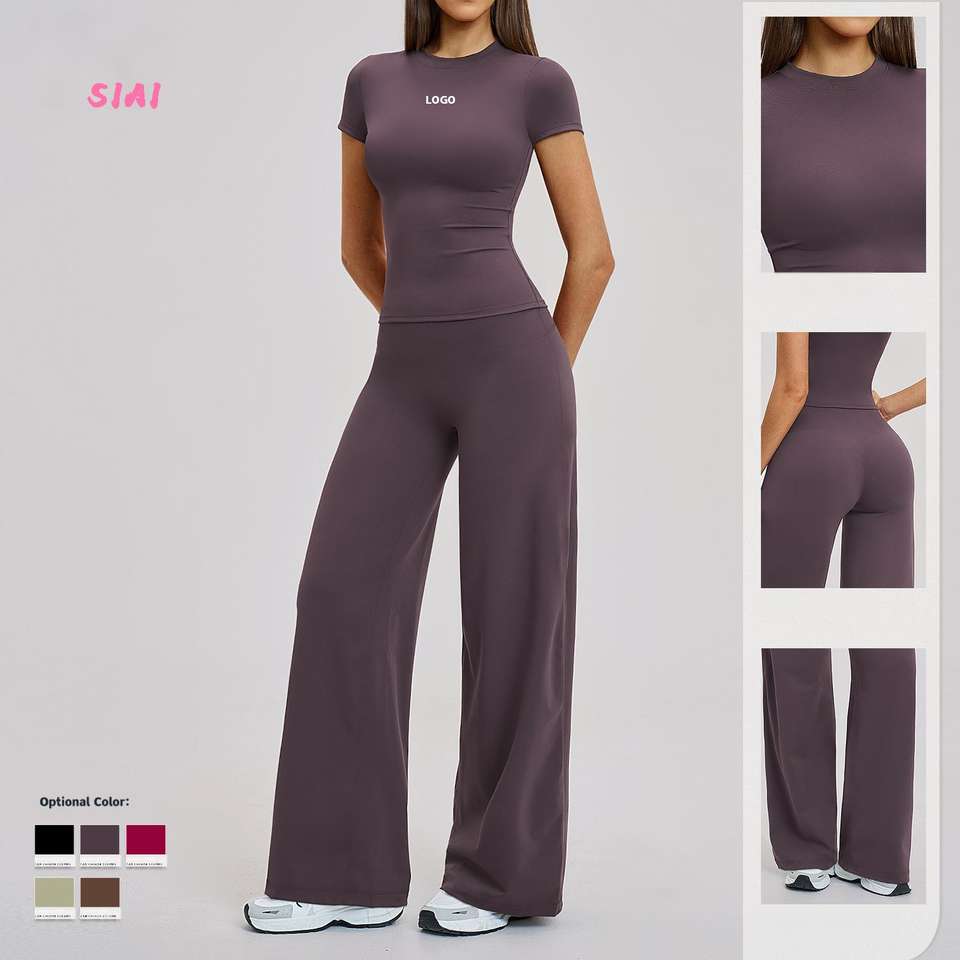 Brushed Plus Size Yoga Set Mid-waisted Loose Straight-leg Pants Sports Fitness T-shirt Outdoor Casual Running Set Four-way