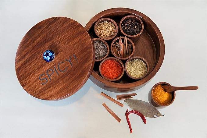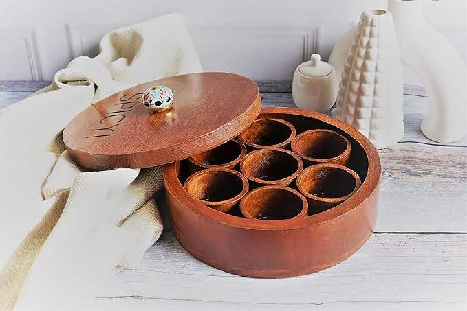 Budget-Friendly Hand-Carved Wooden Masala Box with Removable Spice Containers for Everyday Home Kitchen Use and Kitchen Decor