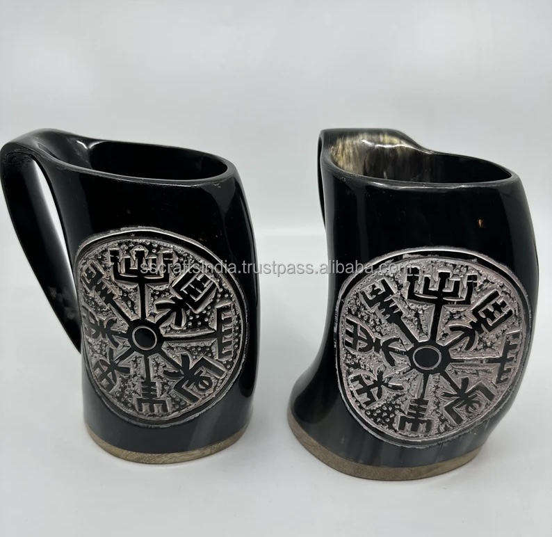 Buffalo motif viking drinking horn handcrafted tankard multipurpose mug for both hot and cold drinks and holiday home decor use