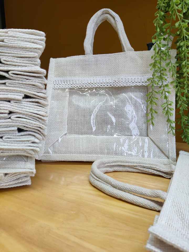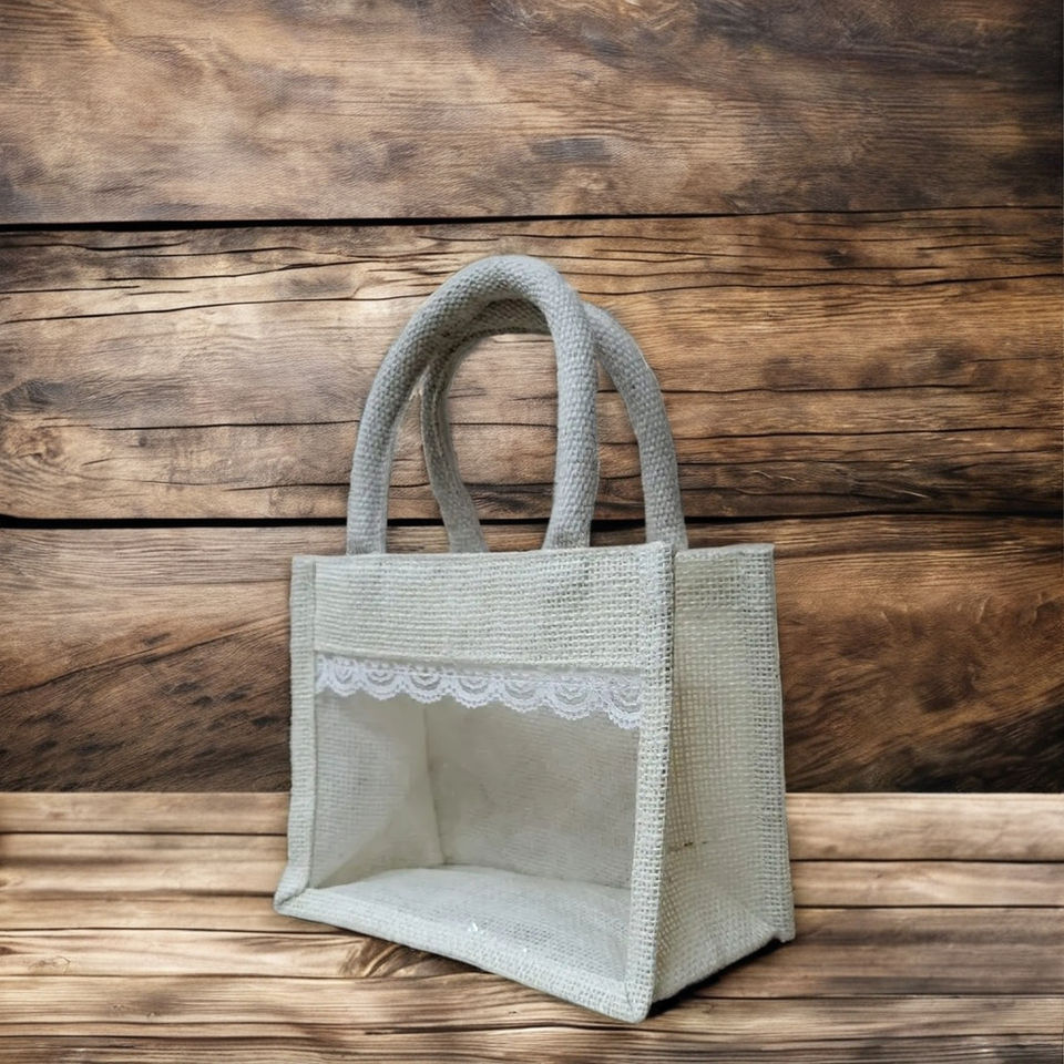 Custom Bulk Jute Gift Bags with PVC Clear Window for Hamper & Party Packaging Return Gifts for Corporate Promotions