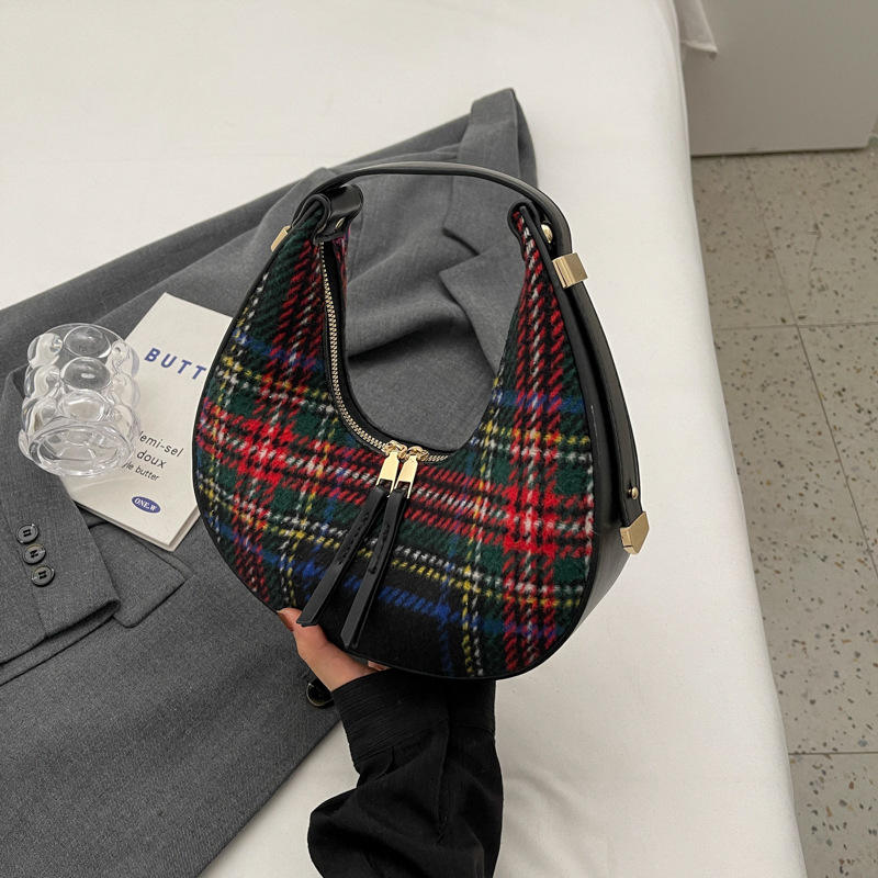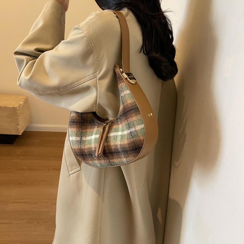 Bulk Stock Retro Fashion Women Woolen Plaid Carrying Dumpling Bag Female Casual Shoulder Underarm Bag