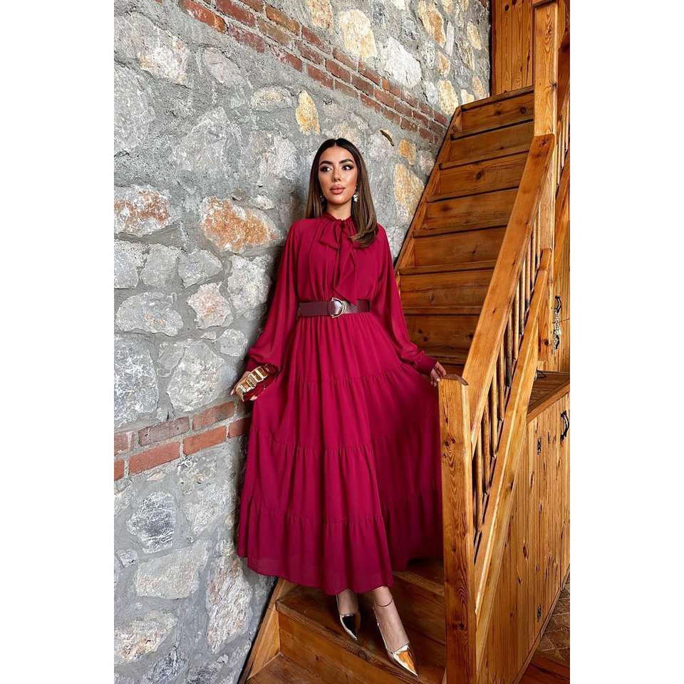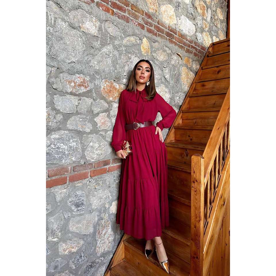 Burgundy Chiffon Dress Tie Neck Loose Silhouette Natural Waist Party Casual Wrap And Tie Translucent